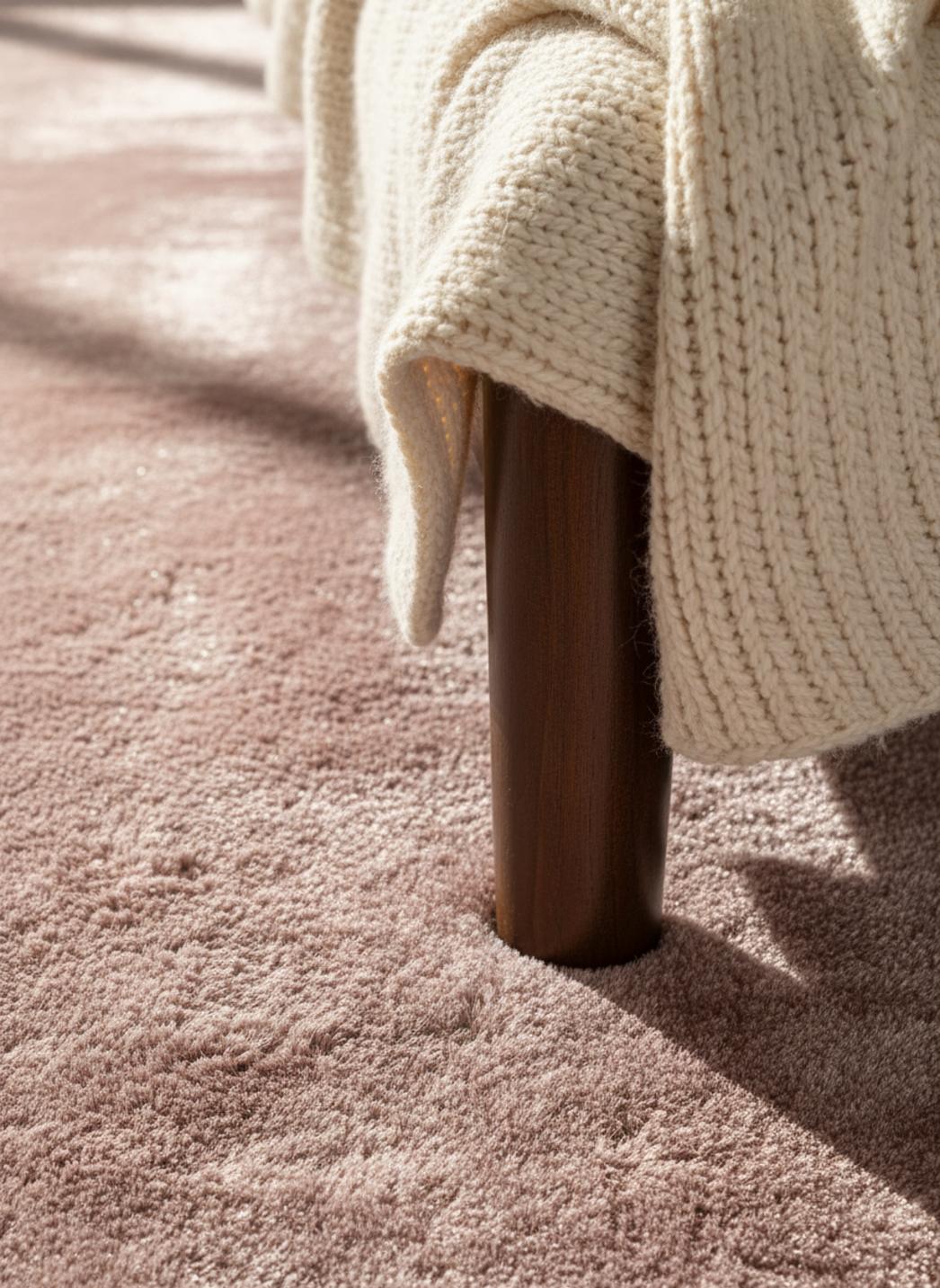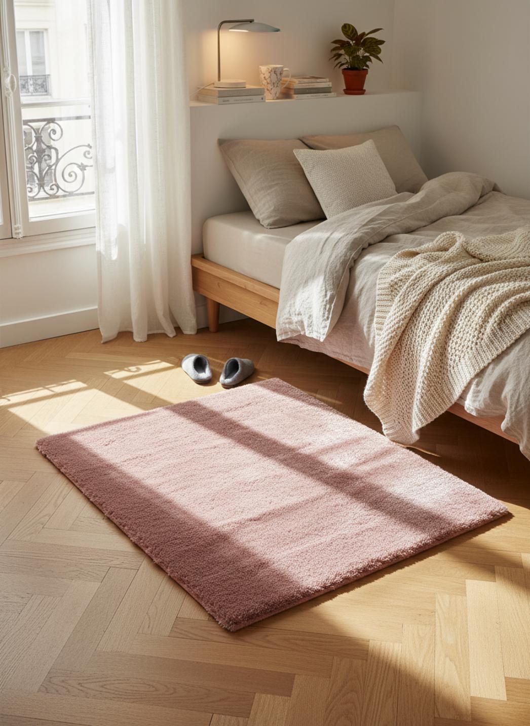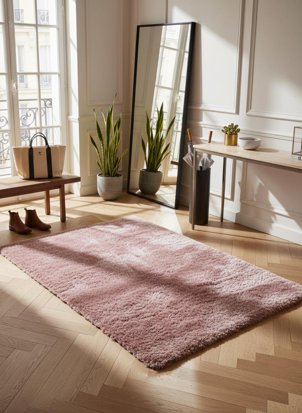 La couleur adoucit l’ambiance : la teinte rose dépose une chaleur poudrée, féminine et contemporaine, capable de rehausser un canapé neutre ou d’entourer un fauteuil dans une bulle de sérénité. La présence visuelle du tapis devient point focal discret, modulant la lumière et donnant à la pièce une atmosphère hygge, cosy et raffinée, tout en restant minimaliste dans son expression.