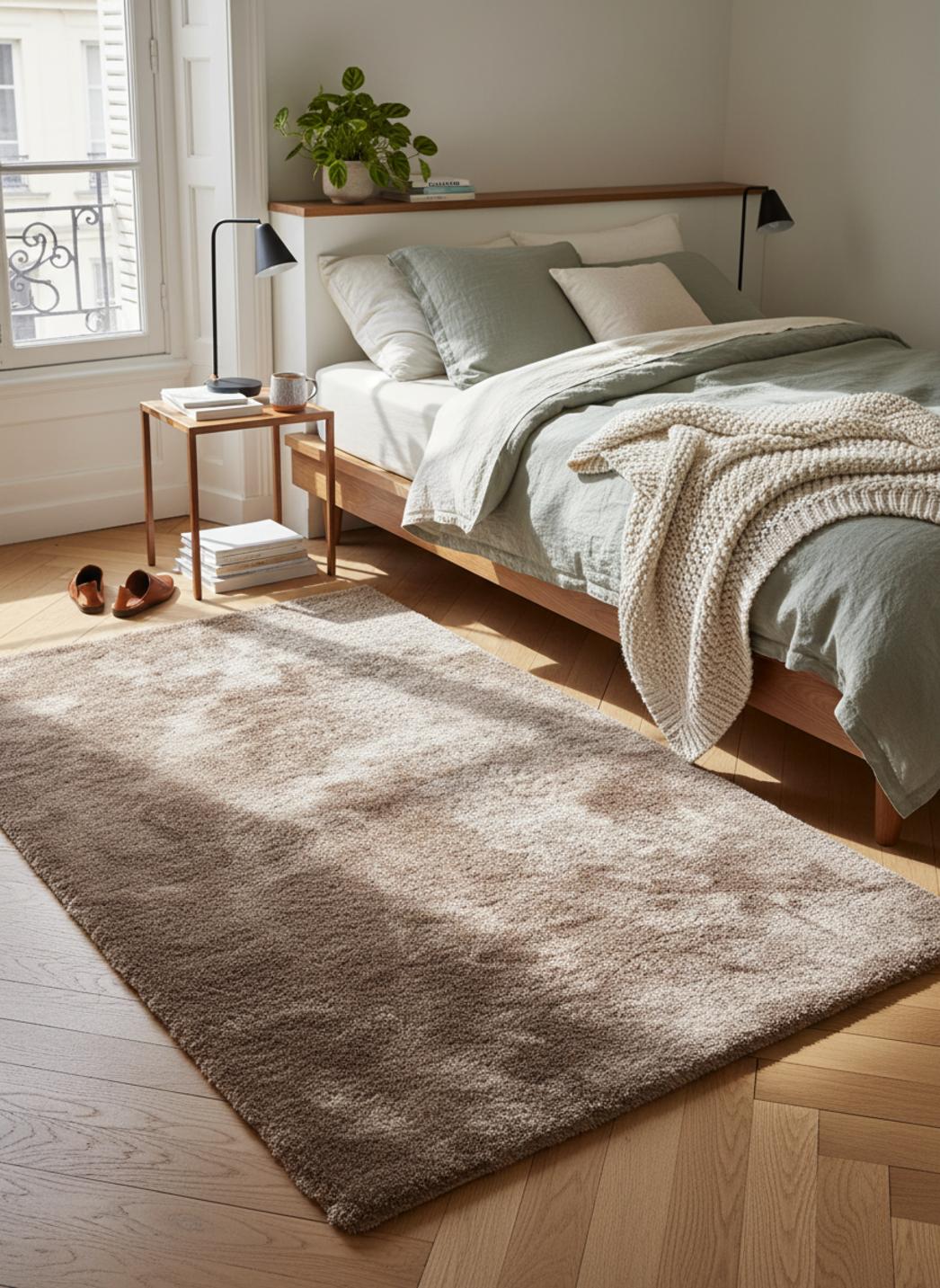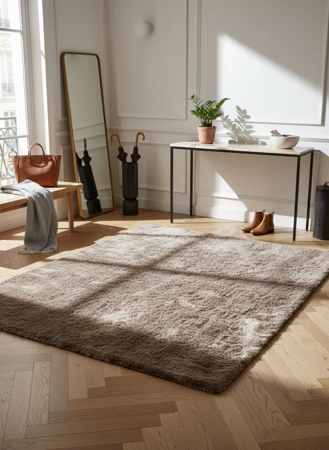 Chaque espace trouve dans ce format une capacité à se réinventer ; posé devant un canapé, il structure le salon, installé au pied du lit il allonge la perspective, et dans un coin de passage il invite au ralentissement. La nuance marron clair s’allie à des teintes naturelles ou à des contrastes plus audacieux pour composer une atmosphère cosy et raffinée.