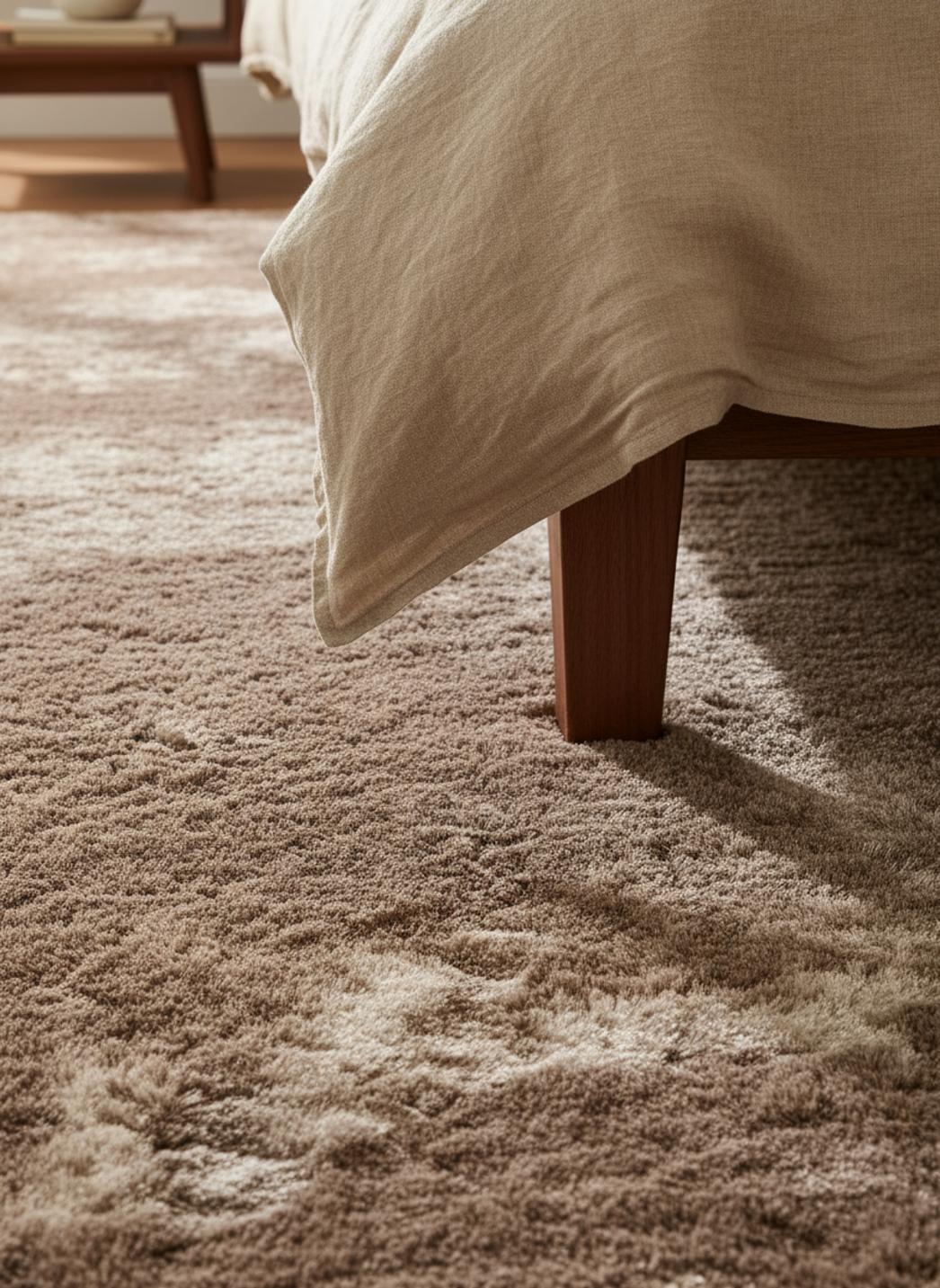 La densité généreuse de cette étoffe crée un moelleux qui soutient et comble : chaque pas s’enfonce légèrement puis retrouve sa forme, l’effet enveloppant atténuant les contours et offrant une assise chaleureuse pour un moment de lecture ou une sieste improvisée. La texture joue avec la lumière, modifiant subtilement la profondeur du marron clair selon l’heure du jour.