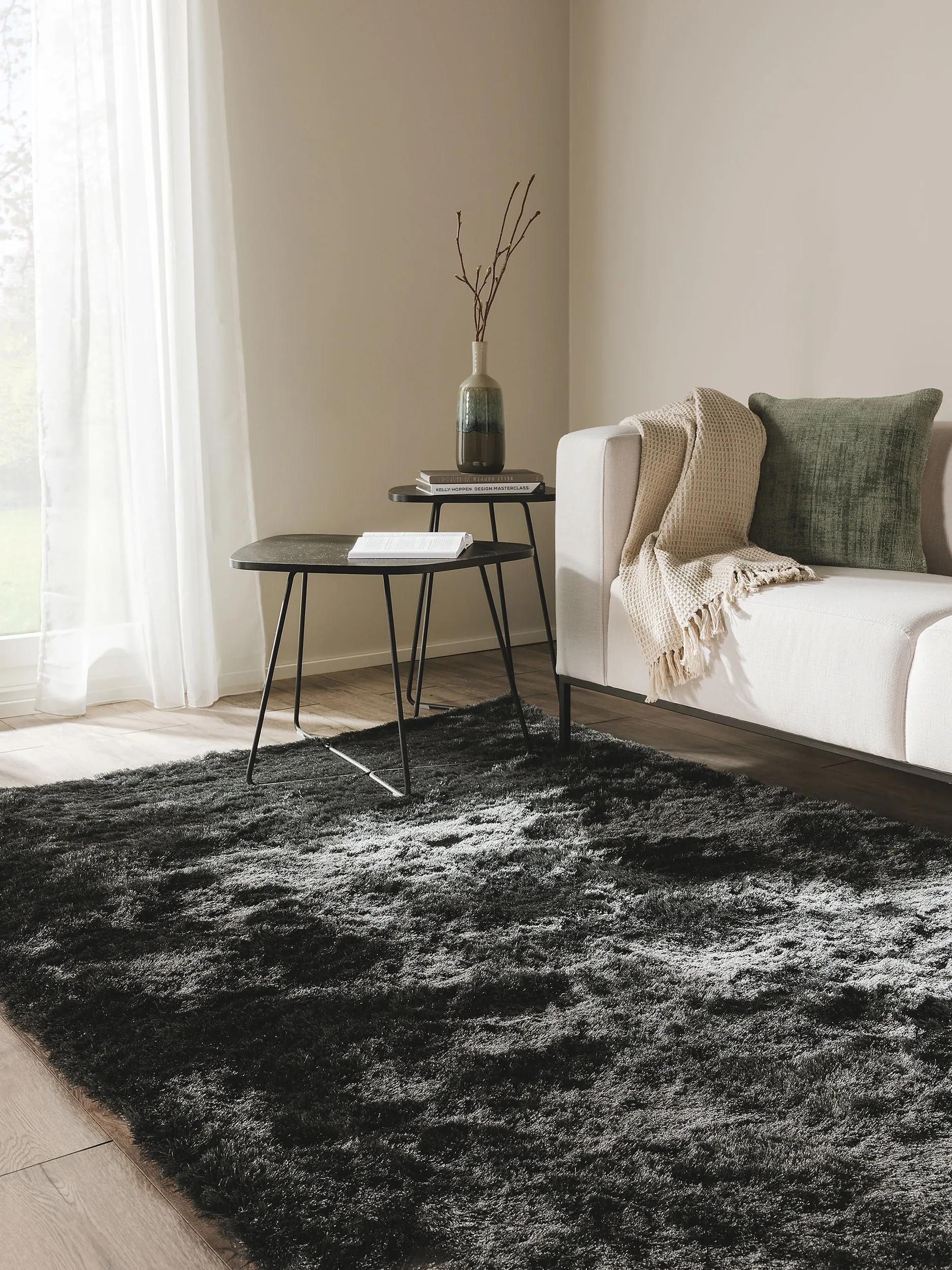 Sous les pas, une caresse profonde invite à la lenteur : le velouté des poils longs déploie une douceur enveloppante qui transforme chaque geste en pause. La silhouette généreuse évoque le confort d’un plaid, une sensation moelleuse et dense qui amplifie la chaleur sous les pieds et instaure immédiatement une présence apaisante au sol, signature d’un tapis shaggy aux accents de fourrure et de teinte charbon.