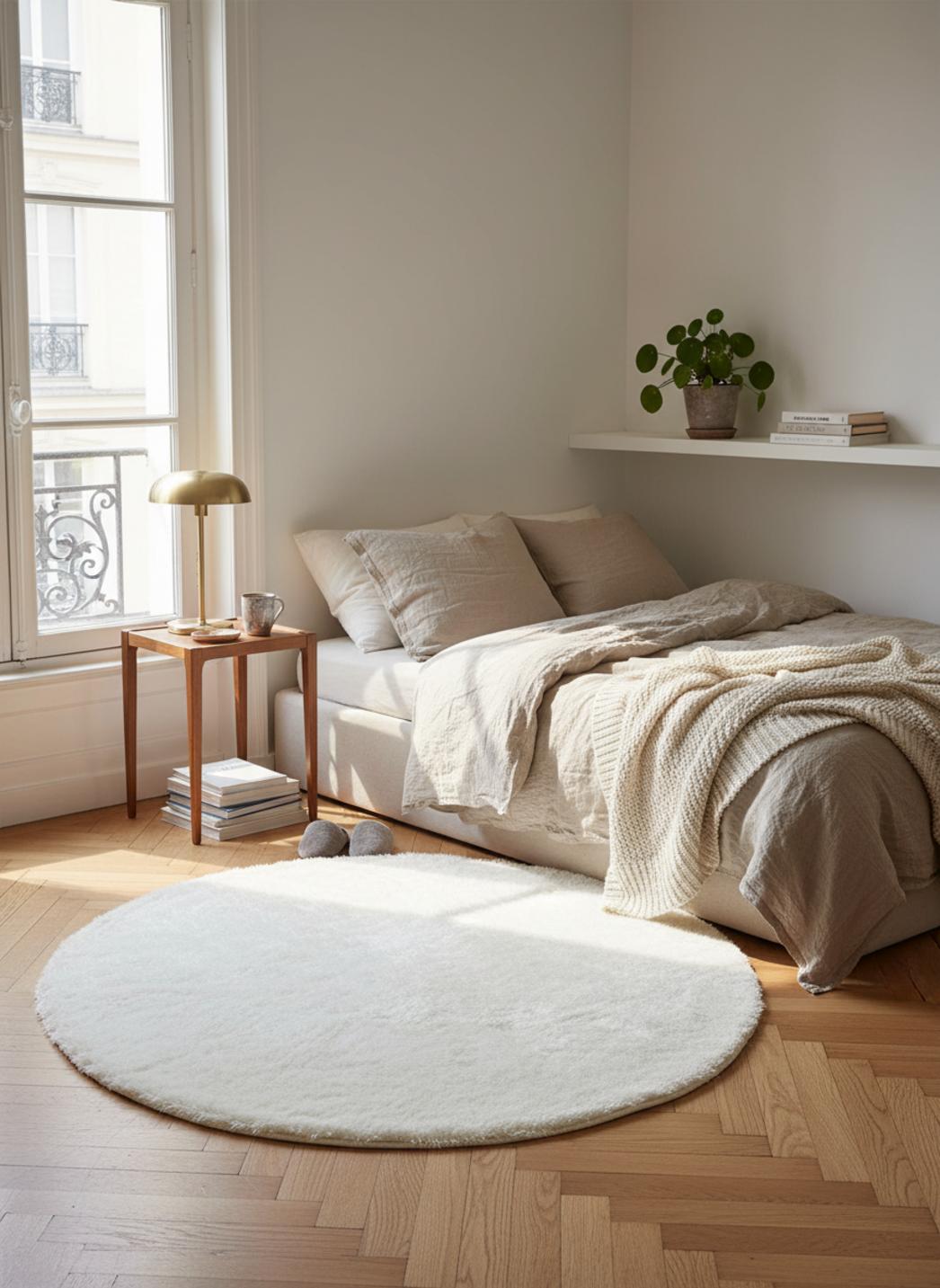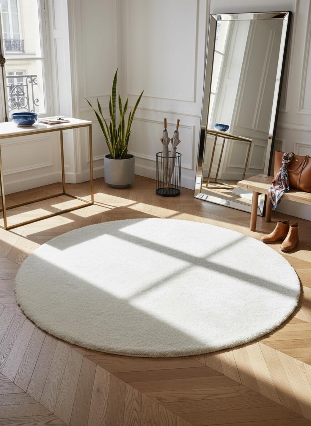 L'effet cocon du format rond crée une douceur visuelle et tactile, transformant un coin lecture en refuge ou ponctuant un salon d’une bulle chaleureuse. Cette rondeur simplifie la composition de la pièce, apporte une note hygge et permet d’installer un espace de confort instantané autour d’un fauteuil ou d’une table basse.