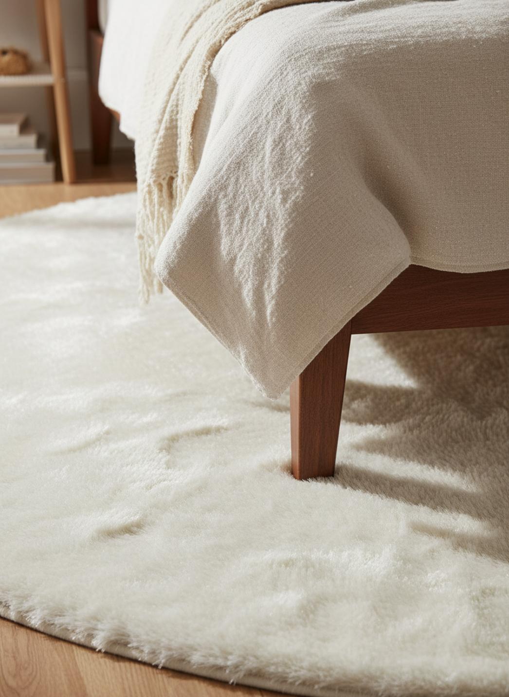 Sentez la caresse d’un tapis shaggy à la fourrure généreuse, où les poils longs se plient et se relèvent sous chaque pas pour offrir une douceur profonde et un moelleux presque enveloppant. Le diamètre de 80 cm confère une présence intime, tandis que le ton blanc accentue une lumière douce et immaculée qui capte le regard sans jamais l’agresser.