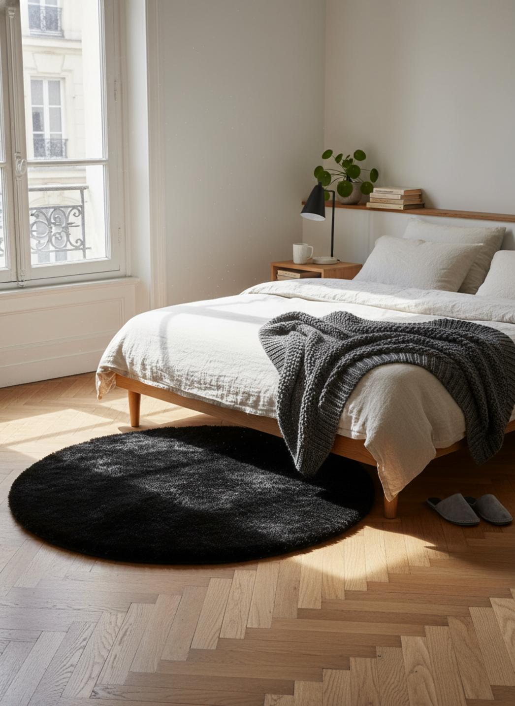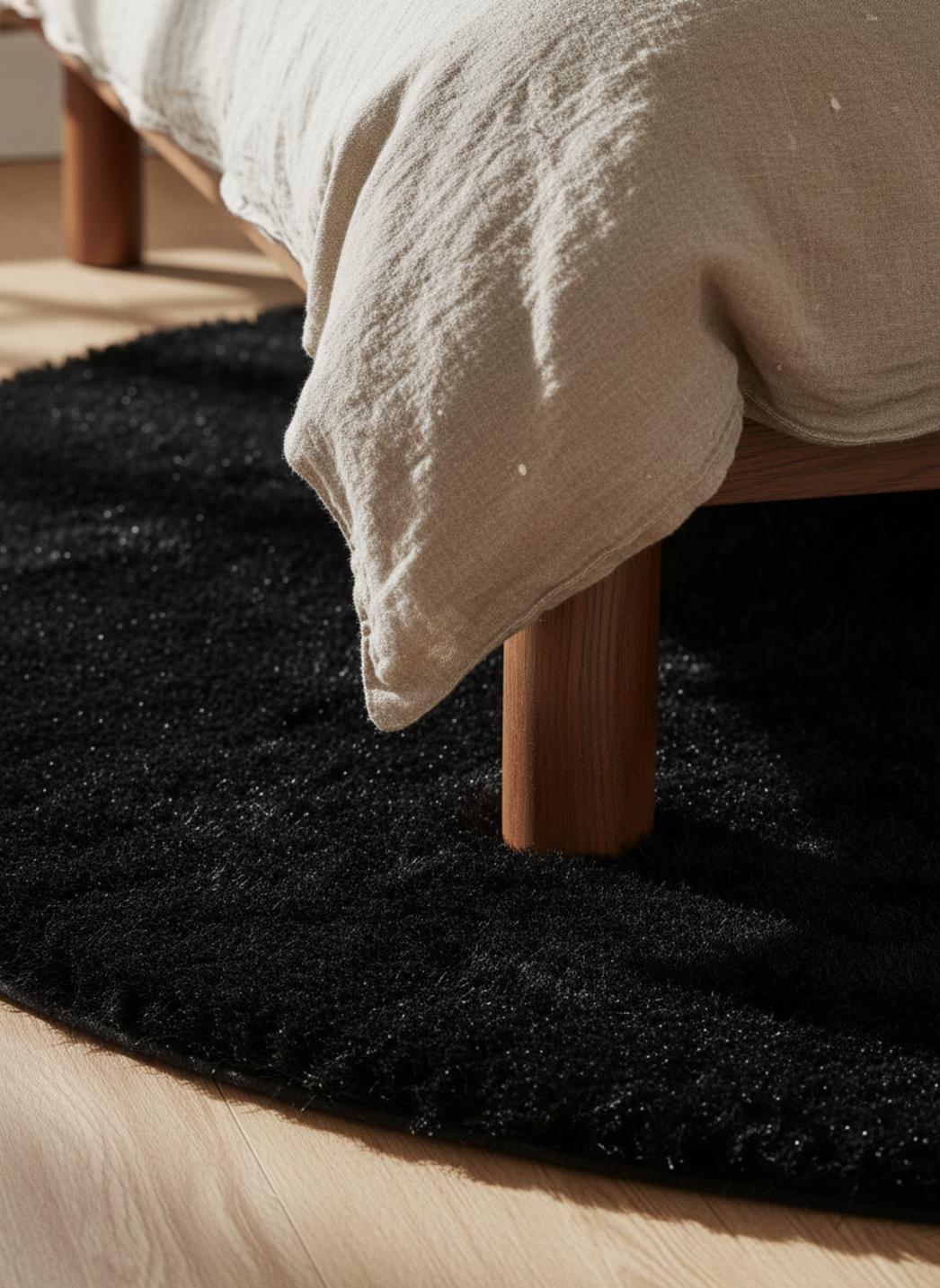 En matière d’acoustique, la longueur des fibres et l’épaisseur généreuse atténuent les résonances; le tapis agit comme une barrière douce contre le bruit, ouvrant une atmosphère plus feutrée propice à la lecture, au repos ou à la conversation. Sa présence visuelle, d’un noir profond, apporte une ligne contemporaine qui contraste avec les matières plus claires et souligne les volumes de la pièce sans en faire trop.