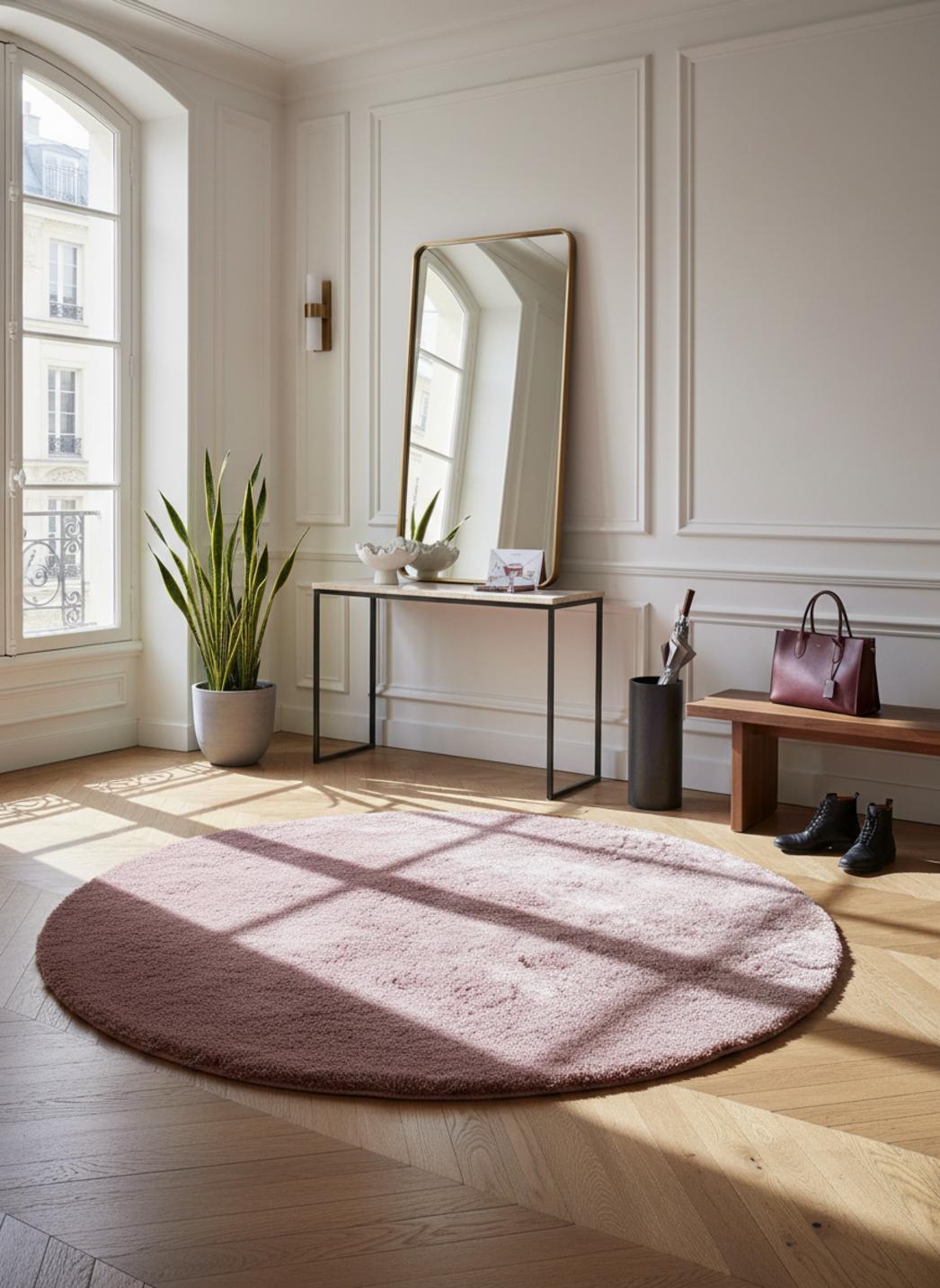La forme circulaire intensifie cette sensation d'abri : la silhouette rond crée un effet cocon et une douceur visuelle qui recentre l'espace. Placé devant un fauteuil, sous une table basse délicate ou au pied d'un lit, il établit un point d'attention doux et raffiné, capable de transformer un coin lecture en refuge propice à la lecture et à la rêverie.