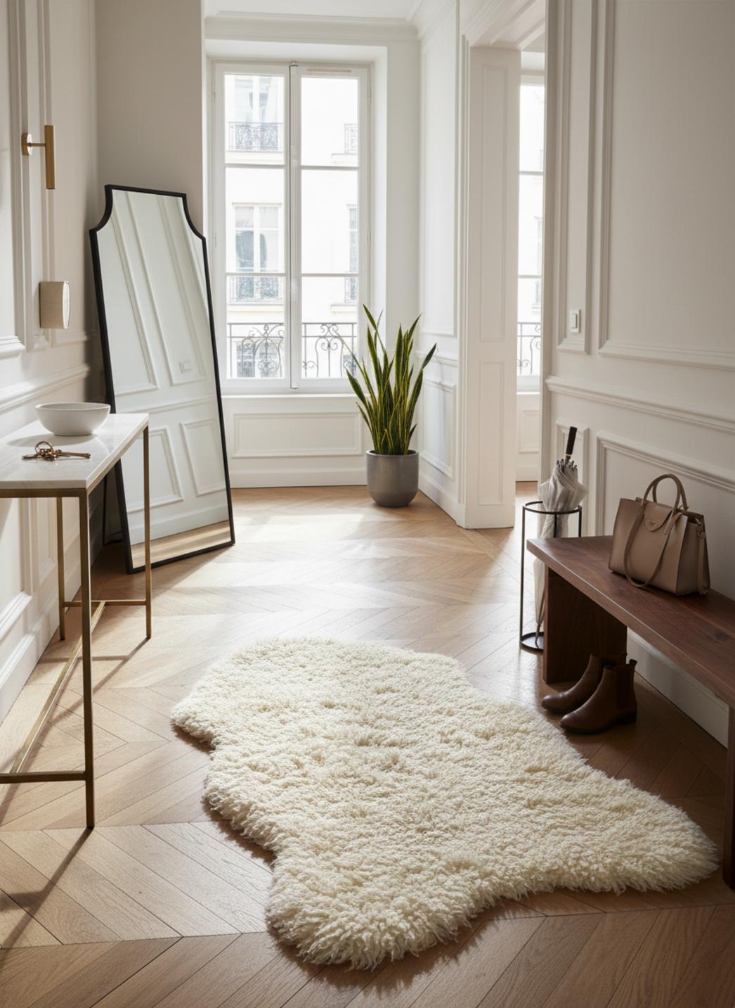 Au premier pas, la surface révèle une caresse longue et généreuse : le mélange de fibres dessine une densité luxueuse qui s’exprime à chaque contact. Le toucher singulier du shaggy et des poils longs crée une profondeur moelleuse où la lumière vient se perdre, et la teinte douce du crème renforce cette impression de chaleur feutrée sans jamais alourdir l’espace.