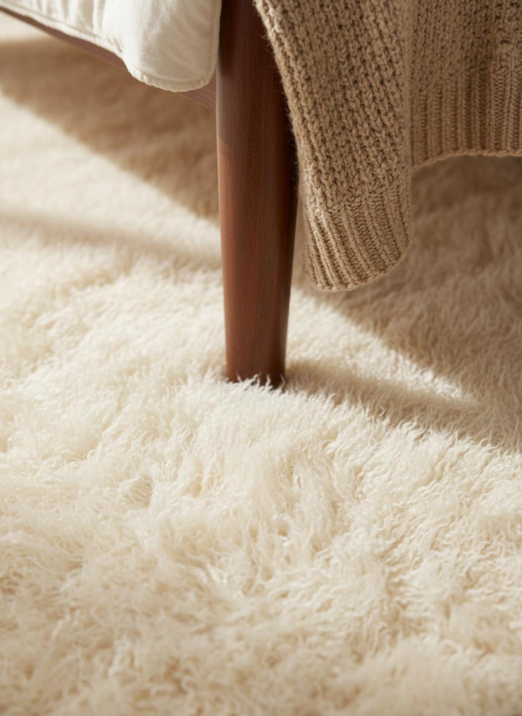 Sur le plan esthétique, le jeu de la pile longue confère une allure voluptueuse et sophistiquée, tandis que la nuance douce de crème épouse les matières naturelles et les palettes neutres. Le rendu est à la fois minimal et riche : il capte la lumière, structure subtilement la pièce et invite au repos visuel, en posant une base accueillante pour les meubles et les textiles.