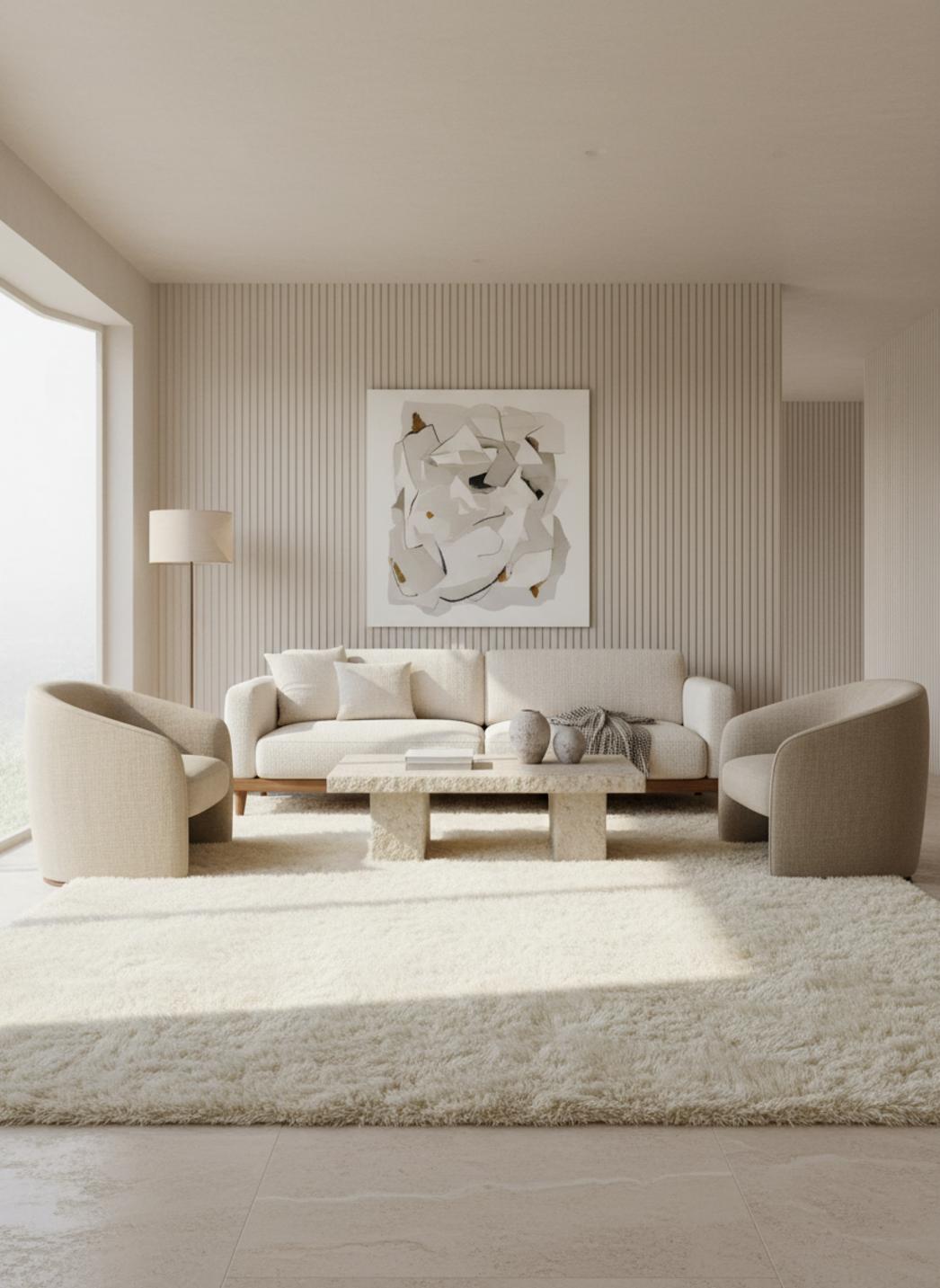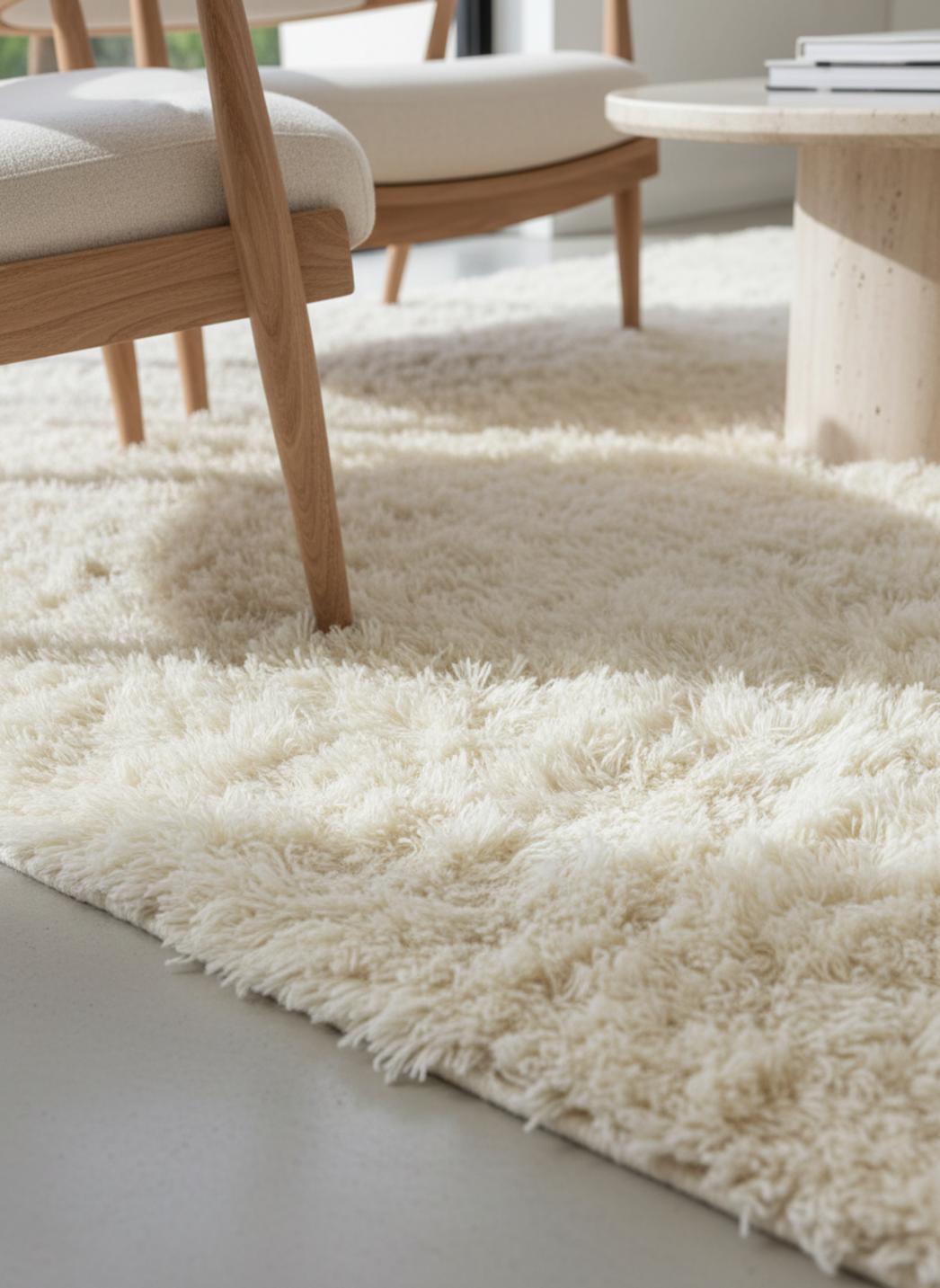 Sous les doigts, la matière révèle une caresse longue et enveloppante : le velouté des fibres crée une profondeur tactile où chaque pas s’enfonce doucement. Le choix d’un shaggy à poils longs confère une douceur profonde, une densité généreuse qui restitue une sensation de moelleux continu, tandis que la teinte crème adoucit la lumière et pose une présence visuelle délicate et apaisante.