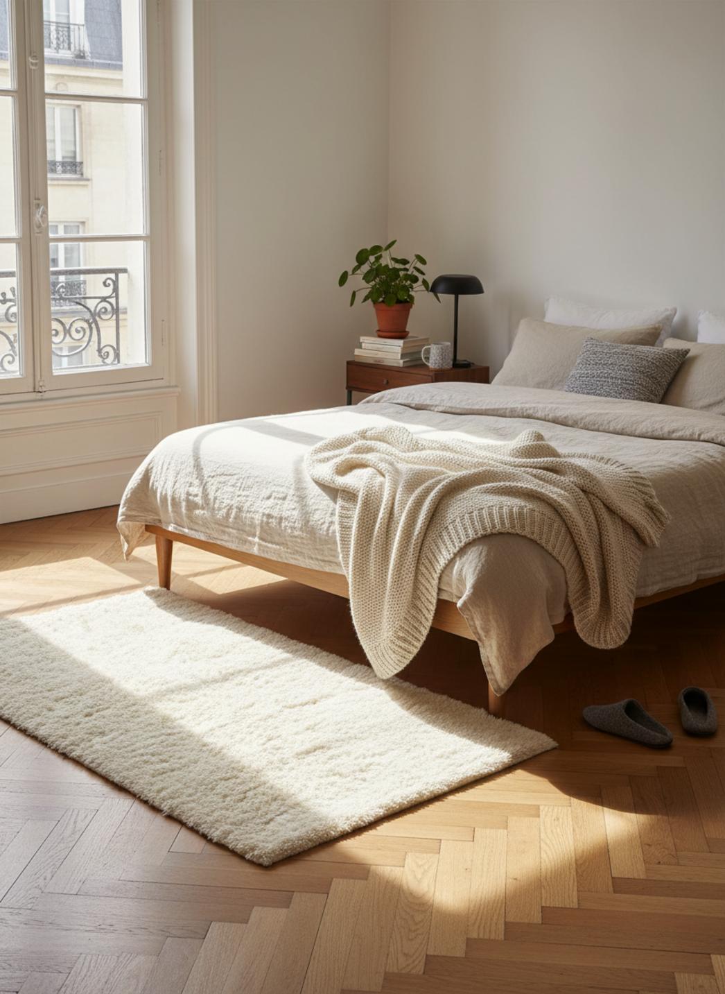Le format pensé pour des espaces mesurés, 60x120 cm, se prête à de multiples usages — en devant de lit pour un réveil plus doux, au pied d’un fauteuil de lecture ou comme tapis d’entrée qui annonce une atmosphère chaleureuse dès le seuil.