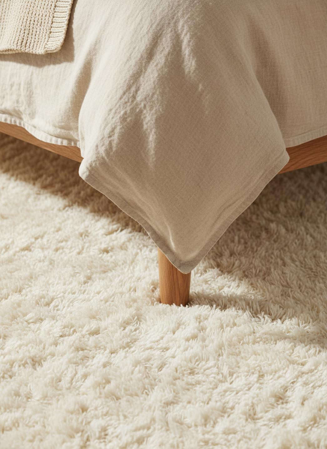 Au premier contact, la surface révèle une qualité tactile remarquable : un velouté profond issu du shaggy aux poils longs, où chaque fibre en laine semble retenir la chaleur et la lumière dans une nuance douce de crème.