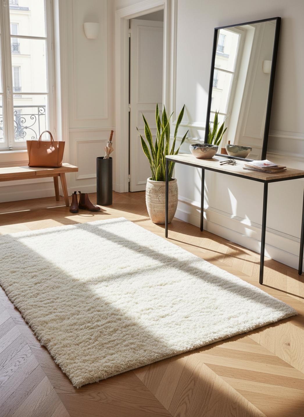 Dans une chambre, près du lit ou en prolongement d’un canapé, ce tapis joue un rôle de point d’ancrage visuel : la teinte crème adoucit les contrastes et crée une présence discrète mais affirmée, tandis que la matière capte subtilement les variations de lumière.