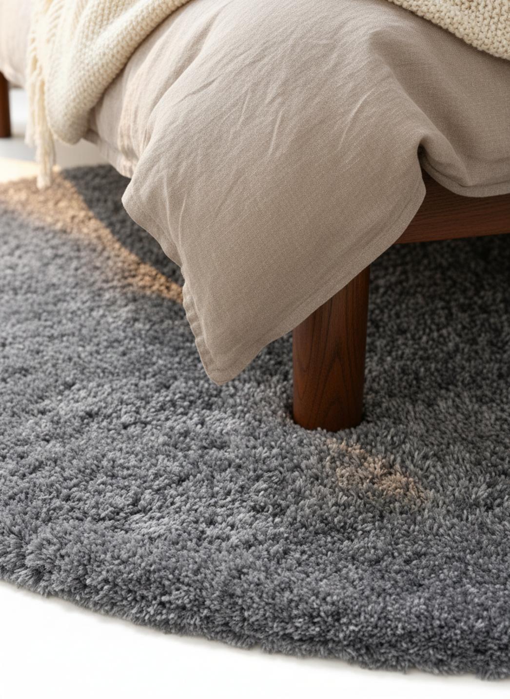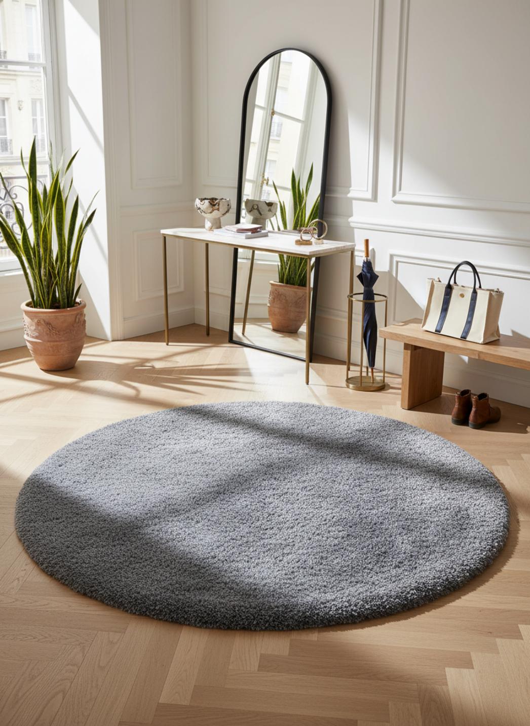 Avec sa silhouette parfaitement rond, ce tapis crée un petit cocon visuel et tactile dans la pièce, apportant une douceur visuelle qui adoucit les lignes du mobilier. Sa forme favorise une installation intime au centre d’un salon, au pied d’un fauteuil pour un coin lecture ou aux côtés d’un lit, où il circule la chaleur sous les pieds.