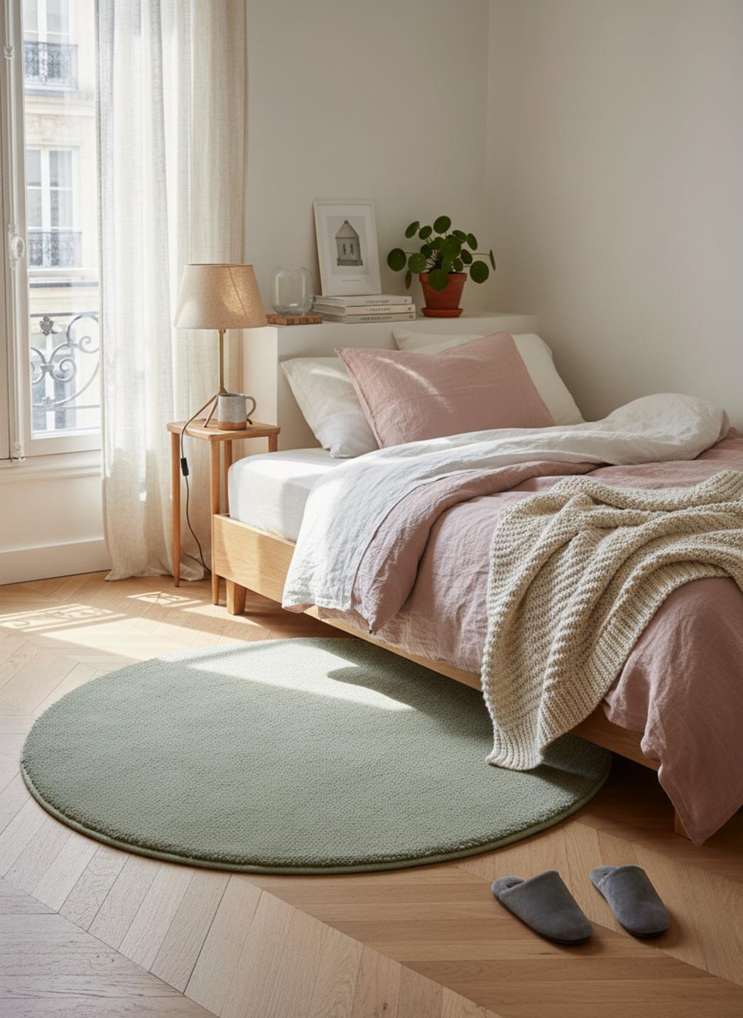 Son format souligne une présence visuelle maîtrisée : ce rond de proportions harmonieuses se place naturellement comme un pivot décoratif, et le diamètre pensé pour un espace singulier met en valeur un mobilier central tout en conservant une élégante sobriété.