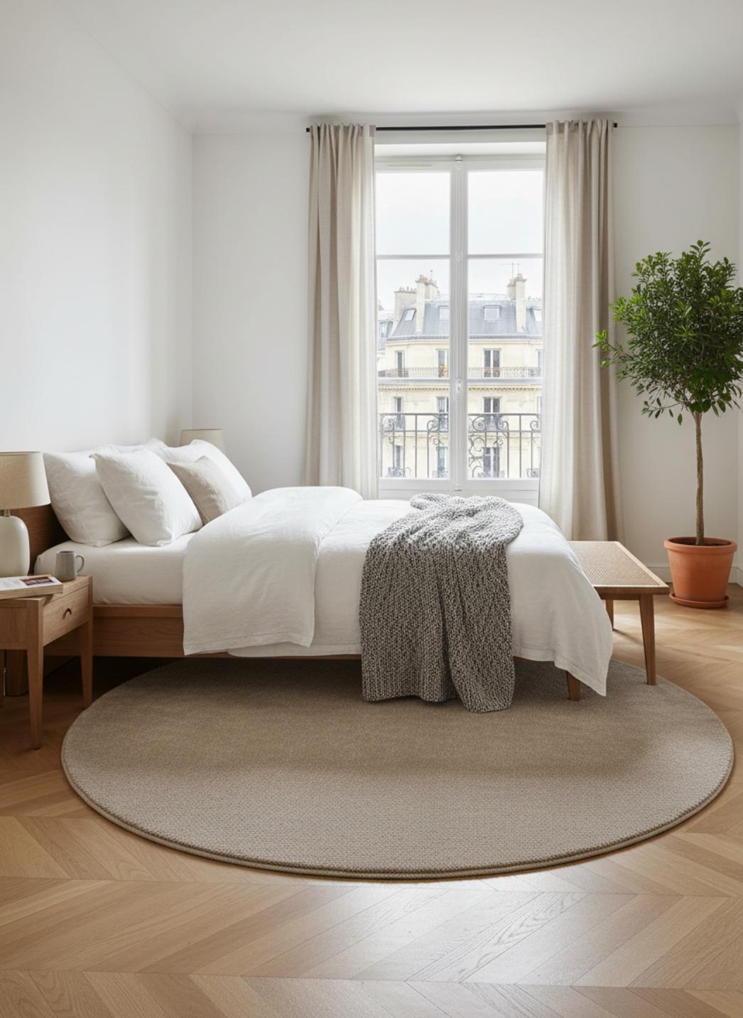 Sa silhouette circulaire de 150 cm de diamètre s’intègre avec élégance dans un salon, une chambre ou un coin lecture, apportant un point d’ancrage visuel sans alourdir l’espace. La présence du tapis redéfinit un coin lecture, réchauffe un canapé ou transforme un sol nu en scène cosy, tandis que le ton neutre laisse place à des ambiances hygge comme à des intérieurs plus minimalistes.
