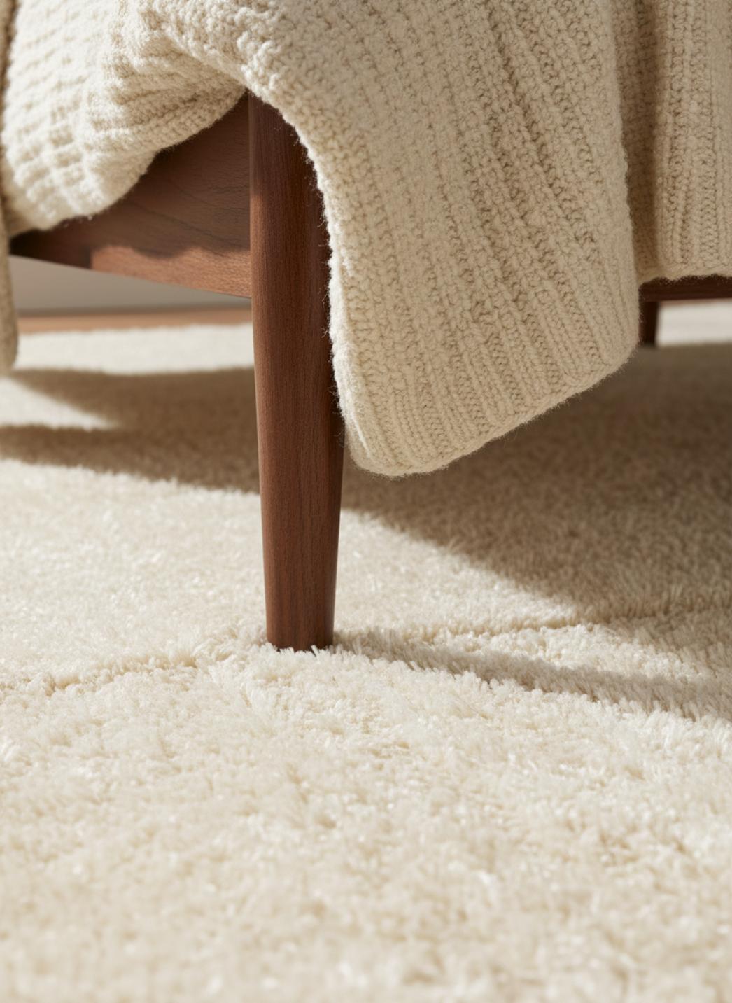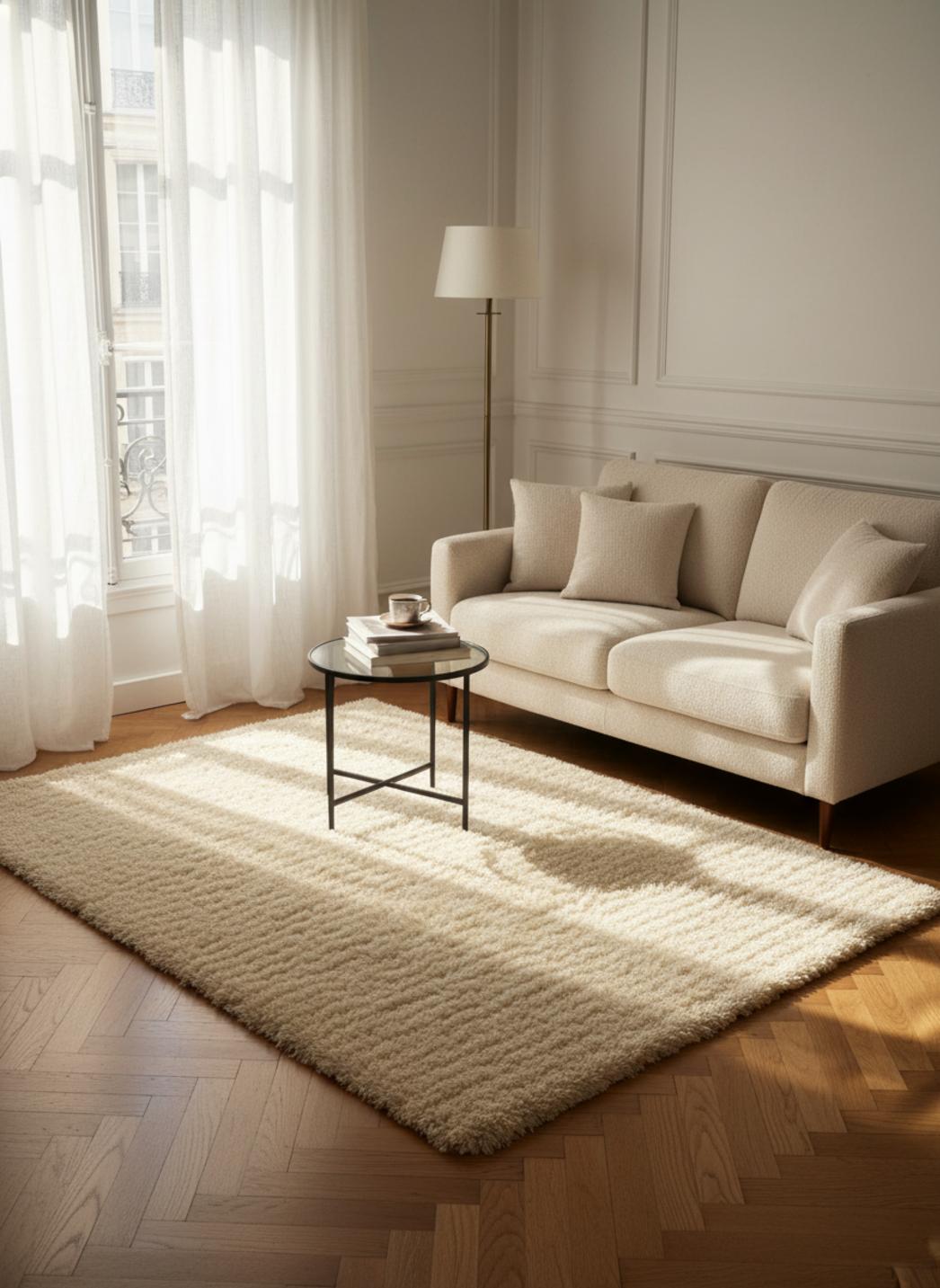 La densité généreuse joue un rôle acoustique discret, absorbant les bruits de la pièce et transformant le silence en une matière feutrée. La présence visuelle reste contemporaine et épurée grâce à la teinte crème, qui diffuse une luminosité douce, idéale pour composer une ambiance hygge ou une décoration minimaliste, tout en conservant une forte personnalité tactile.