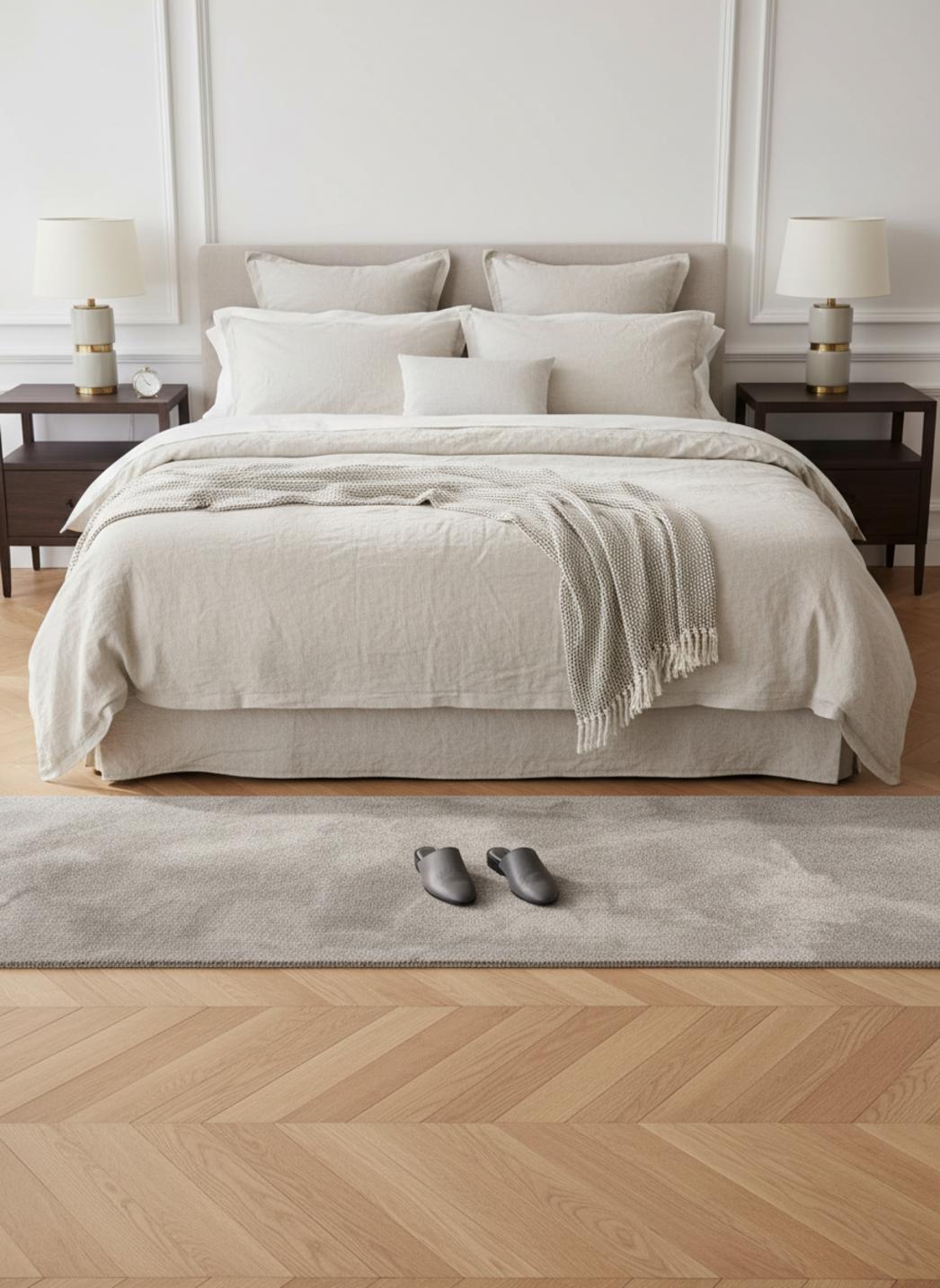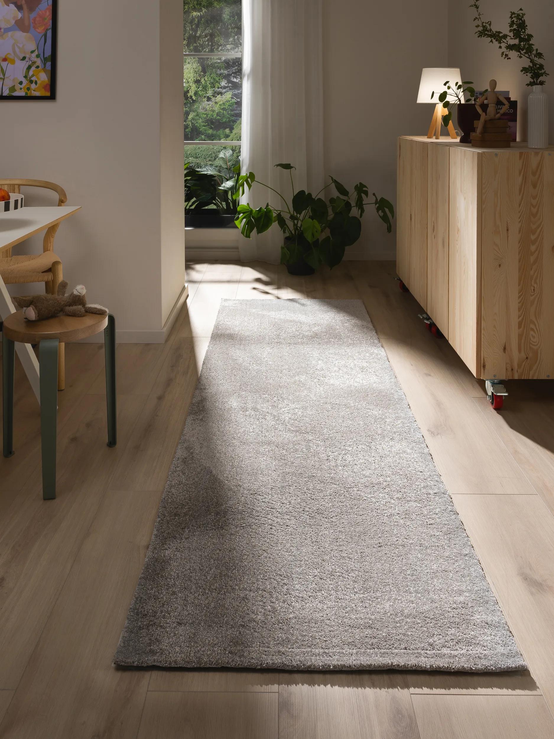 Dans un couloir, sa silhouette longue adoucit les lignes et casse la dureté des passages. Le format 80x250 cm épouse l’espace, créant un trajet confortable et visuel qui invite à la lenteur. Posé entre deux pièces, il transforme le couloir en un fil conducteur chaleureux, adoucissant les espaces étroits et soulignant la circulation intérieure.