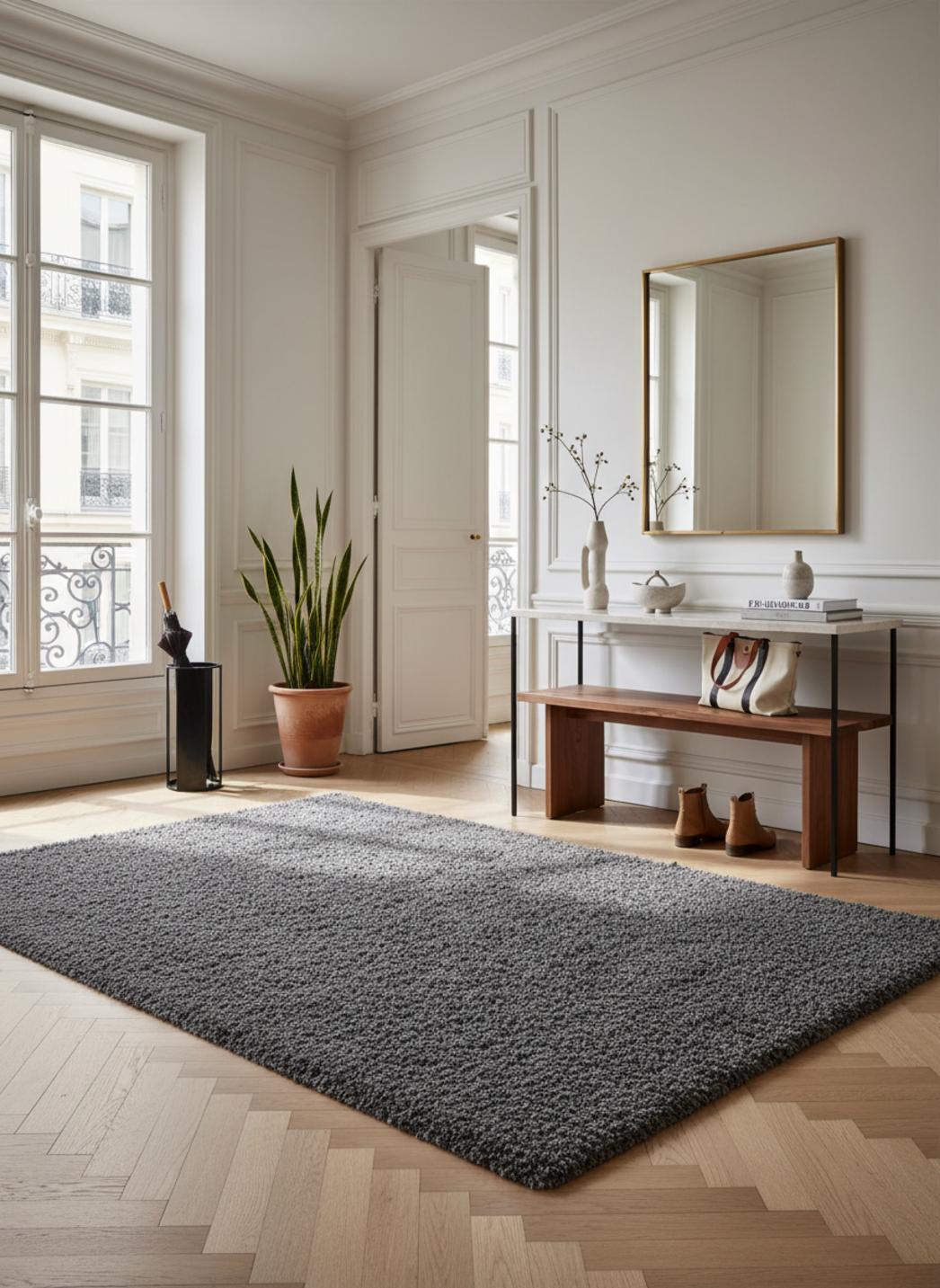 Chaque détail de ce modèle met en avant l’équilibre visuel et la sobriété : un rendu uni qui sublime la pièce sans la charger, tandis que la teinte gris foncé ancre l’espace et apporte une présence discrète mais affirmée. Sa densité généreuse offre une profondeur visuelle et une chaleur sous les pieds qui habillent le salon comme la chambre d’une atmosphère résolument contemporaine.