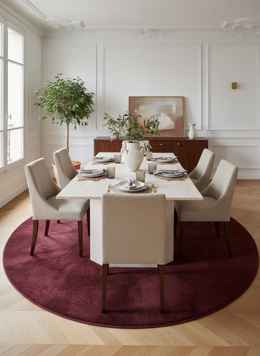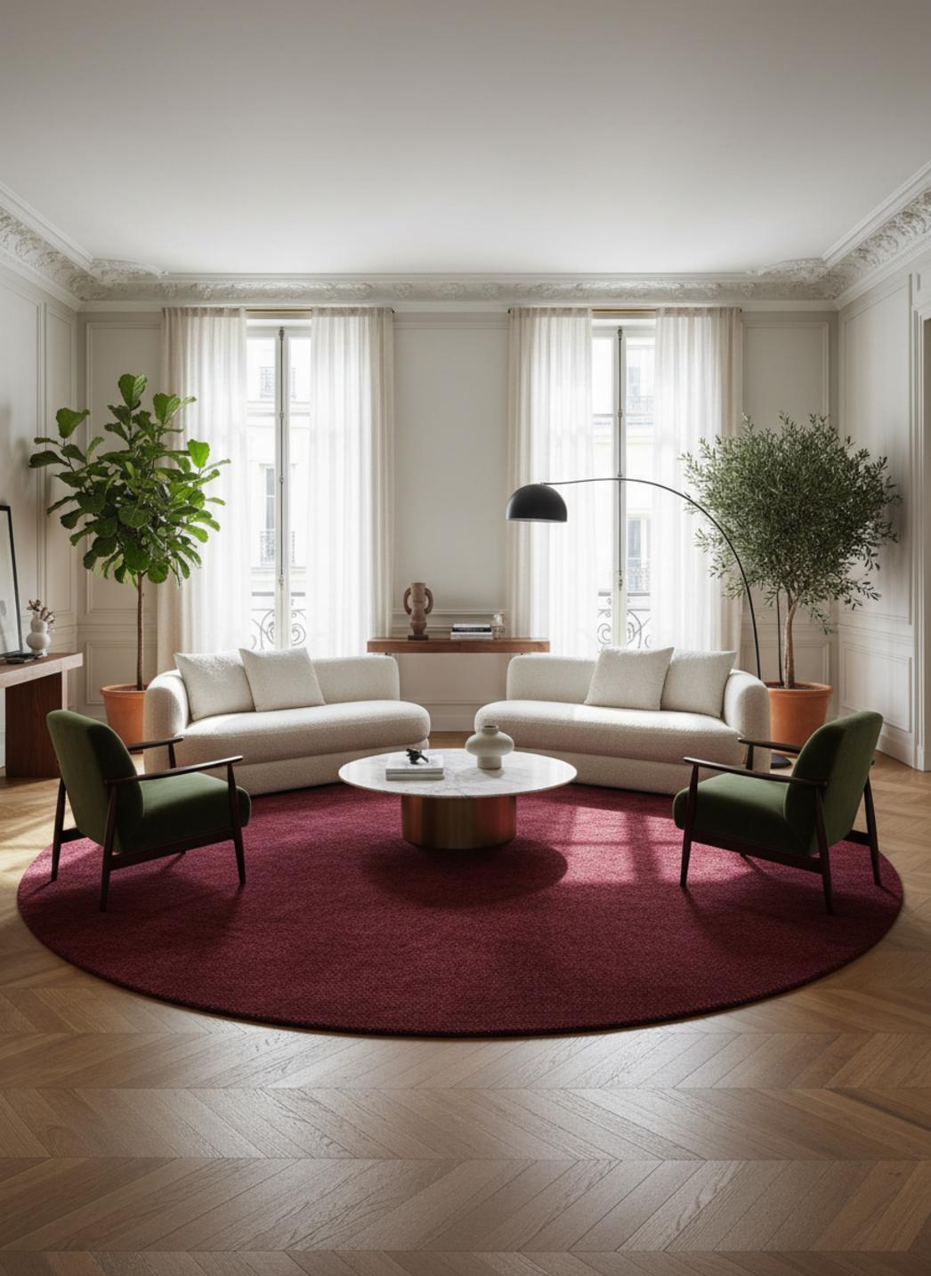 La forme rond accentue ce sentiment de cocon et apporte une douceur visuelle qui arrondit les angles d’une pièce. Placé au centre d’un salon, sous une table basse ou devant un fauteuil de lecture, il crée un îlot de confort, favorisant des conversations lentes et des pauses intuitives. Dans une chambre, sa rondeur invite à se délasser ; dans un petit espace, il suffit à structurer et à adoucir l’atmosphère sans alourdir.