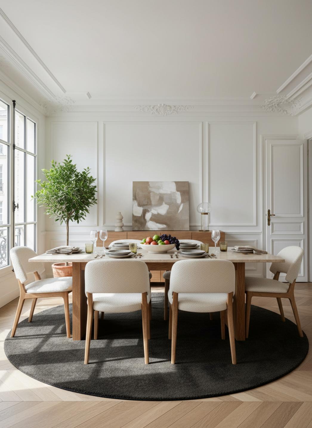 Conçu pour se fondre dans des usages variés, ce format de 200 cm assume son amplitude tout en respectant l’équilibre de la pièce, capable de délimiter un coin canapé ou de ponctuer un espace central avec une élégance maîtrisée. Les volumes se répondent, la pièce respire et chaque meuble retrouve un ancrage visuel grâce à la profondeur apportée par la pièce centrale.