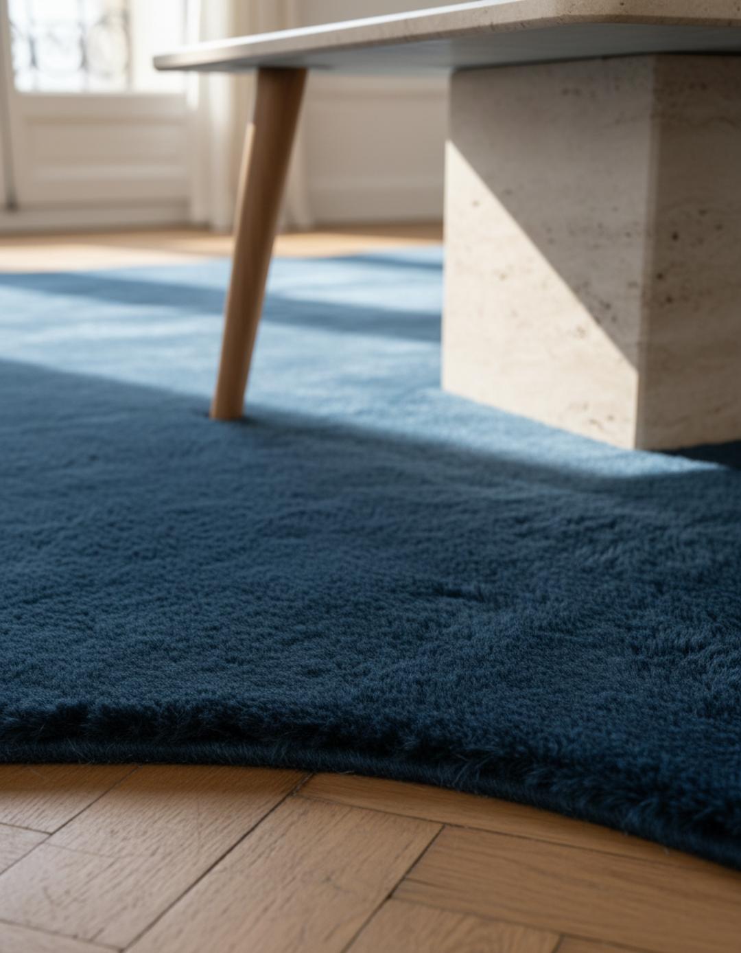 La présence picturale du motif en vague instille une dynamique apaisante, et la teinte bleu apporte une profondeur contemporaine qui calme le regard. Sa texture généreuse joue sur les reliefs, proposant une esthétique à la fois moderne et intimiste ; l’effet visuel est une mer douce sous le mobilier, un tableau discret qui structure la pièce sans la dominer.