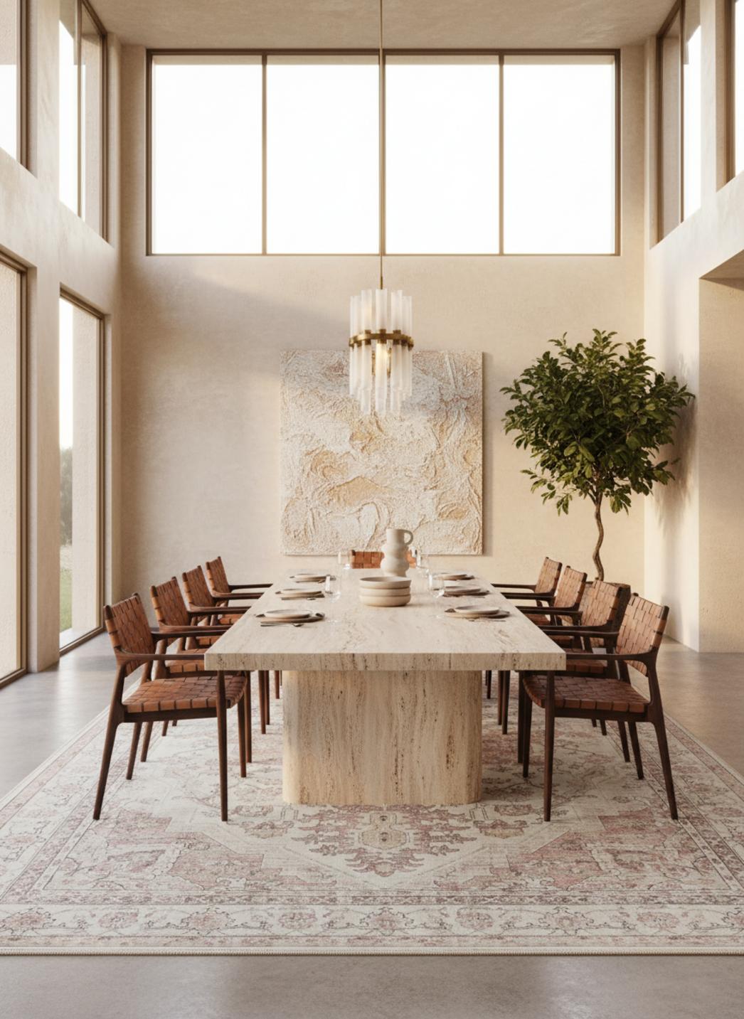 Ce modèle, dans un format généreux de 240x340 cm, installe une atmosphère immersive et enveloppante : il accueille le mobilier, définit un salon, propose une scène intime pour les lectures tardives et les conversations au coin du feu. Sa capacité à transformer l’ambiance est subtile mais décisive, donnant au lieu une signature chaleureuse et vécue qui invite au ralentissement.