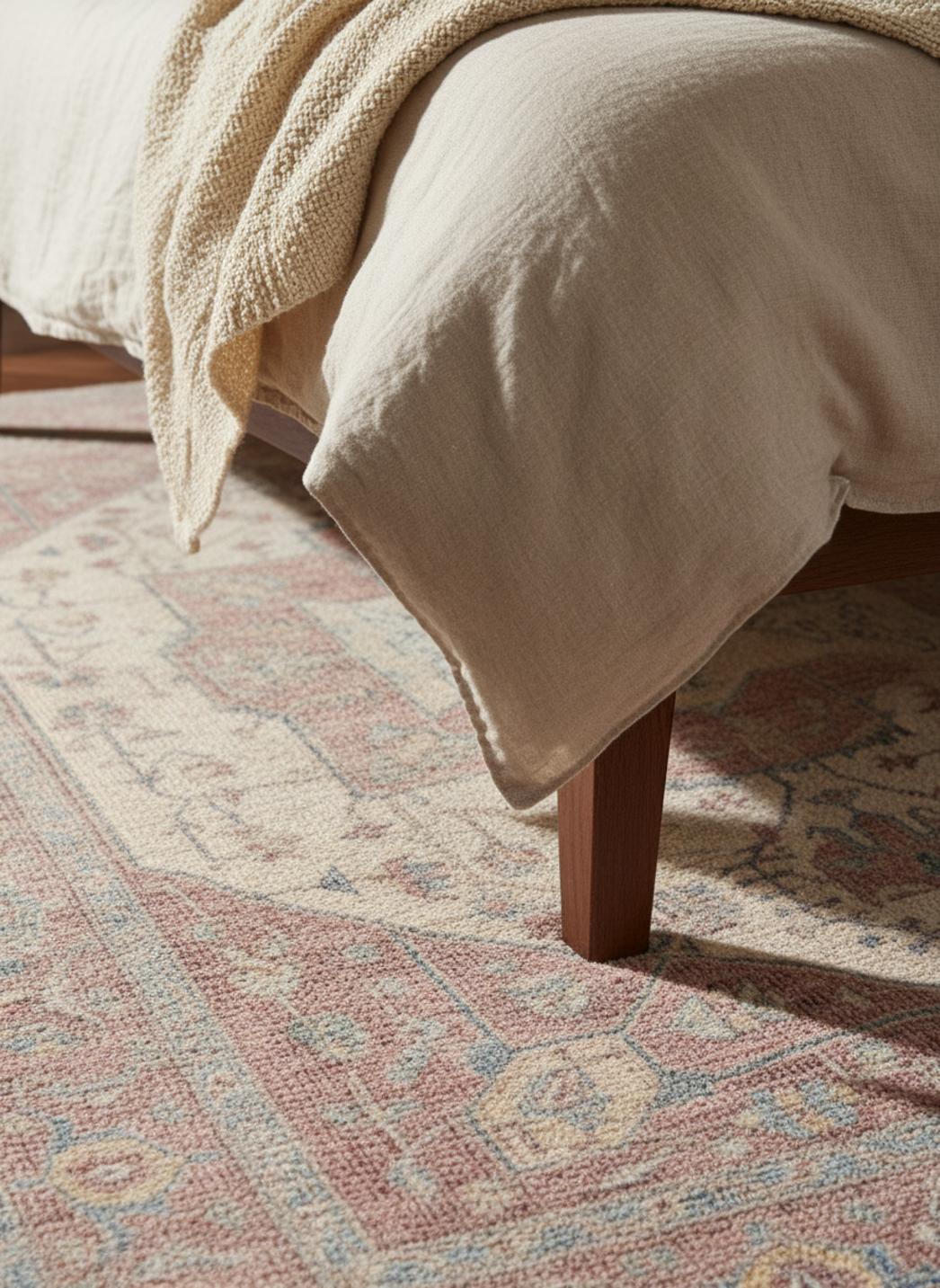 Les motifs anciens, revisités par un esprit contemporain, apportent une structure graphique sans lourdeur : arabesques estompées, fers de lance atténués et frises au charme patiné forment un tout harmonieux. Cette présence graphique agit comme un point d'ancrage pour la pièce, modulant la lumière et soulignant les volumes. Les variations de teintes transforment la luminosité, les rouges patinés absorbent et réchauffent, tandis que les beiges réfléchissent une clarté douce, changeante selon l'heure et l'intensité du jour.