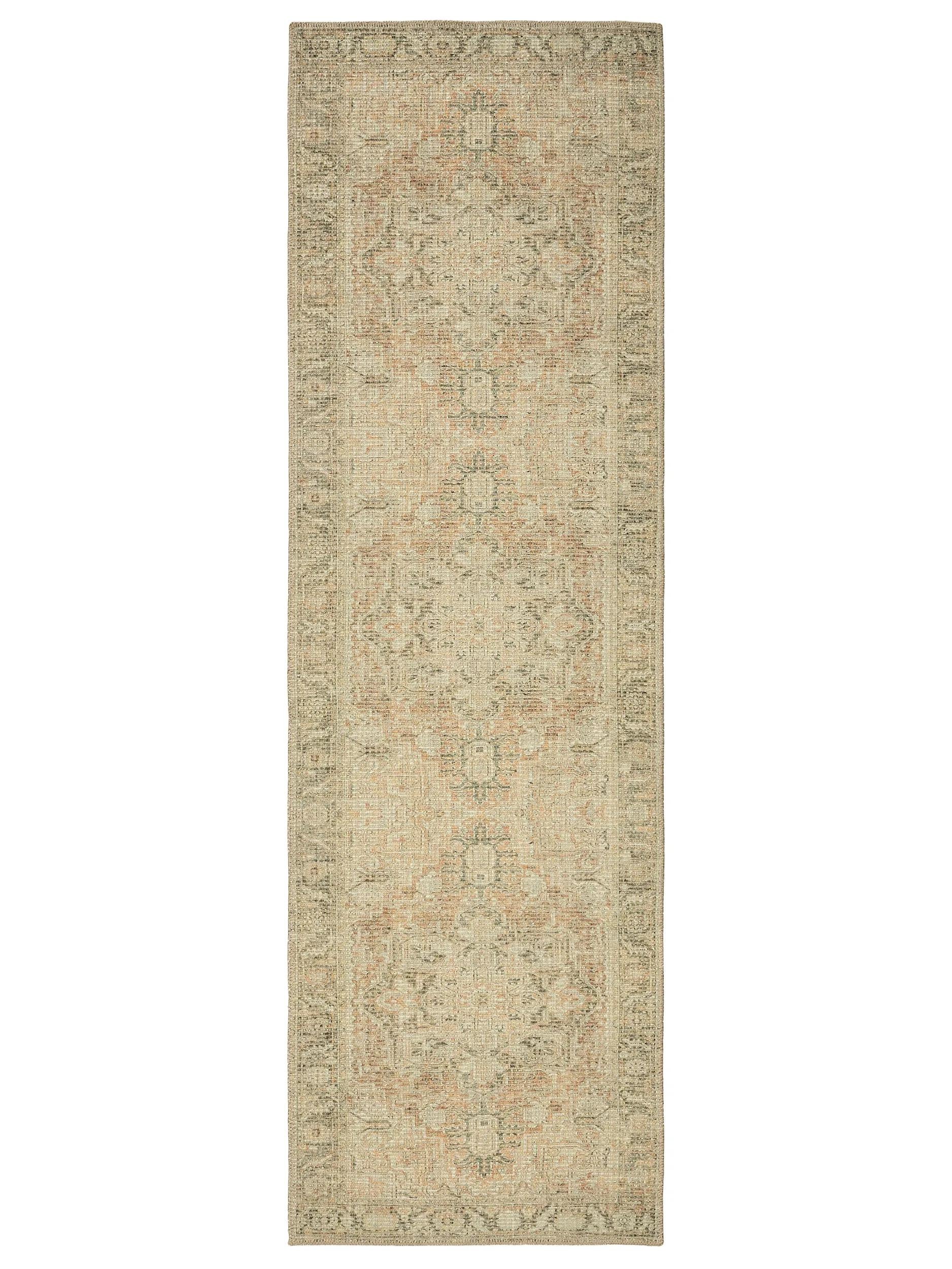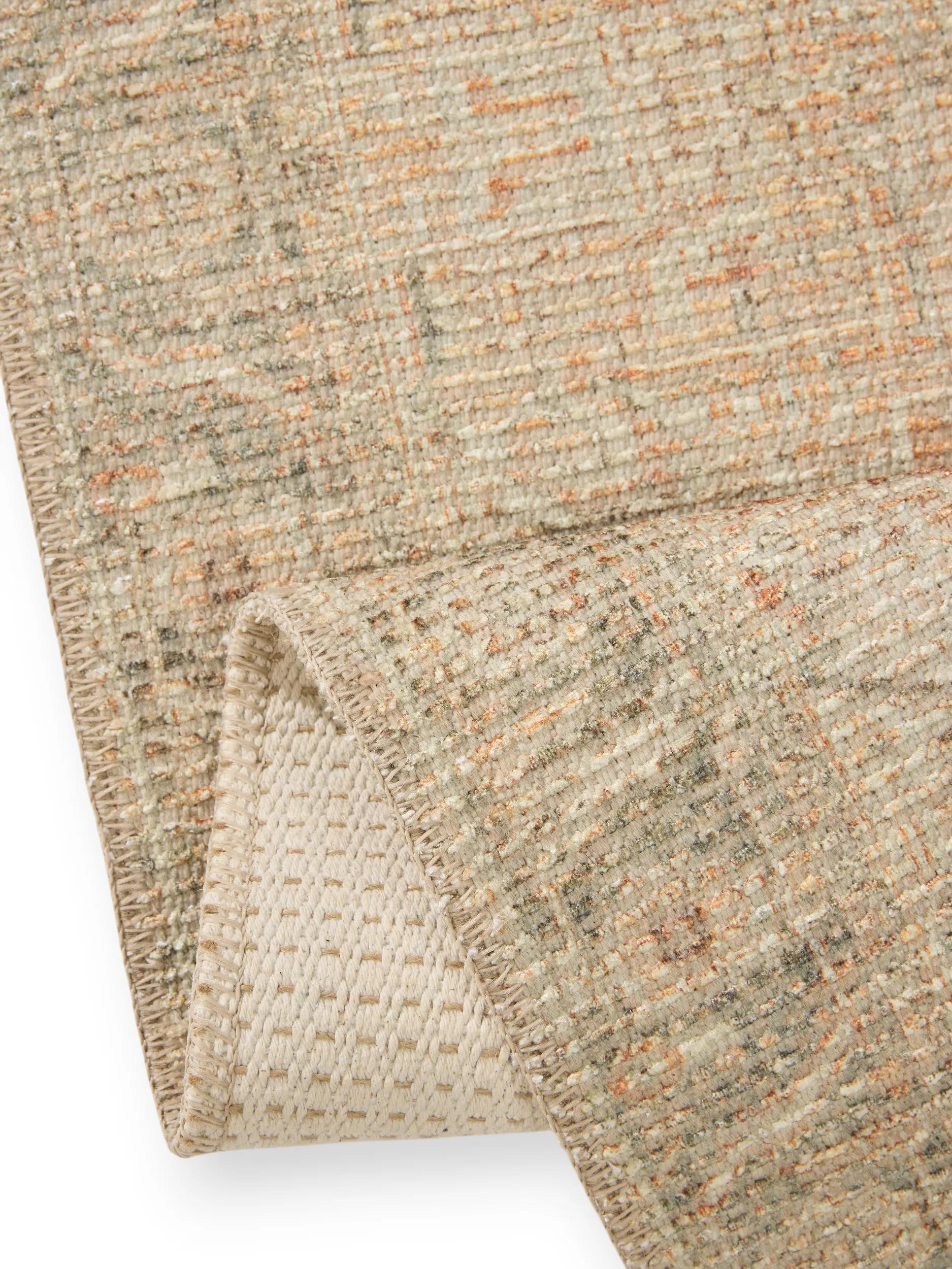 En entrant dans la pièce, la texture raconte une histoire patinée : ce tapis évoque un passé précieux porté par le temps, où chaque fil semble avoir été caressé par des années d’usure élégante et par un esthétisme résolument vintage. La palette dominée par un beige doucement passé laisse apparaître des nuances feutrées qui suggèrent des après-midis de lumière filtrée et des souvenirs imprimés dans la trame.