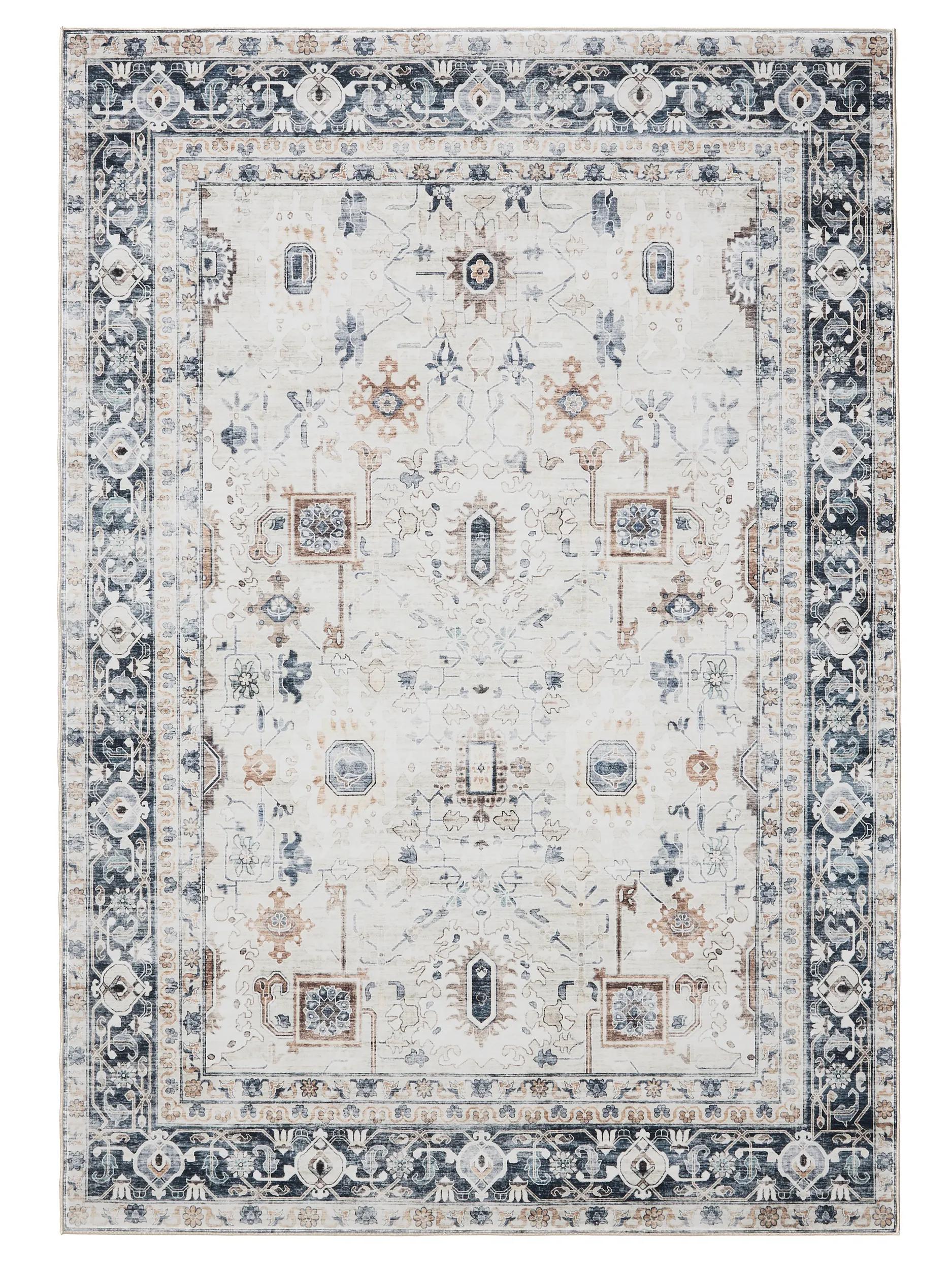 Tapis vintage motif ethnique blanc et bleu lavable 120x170 cm