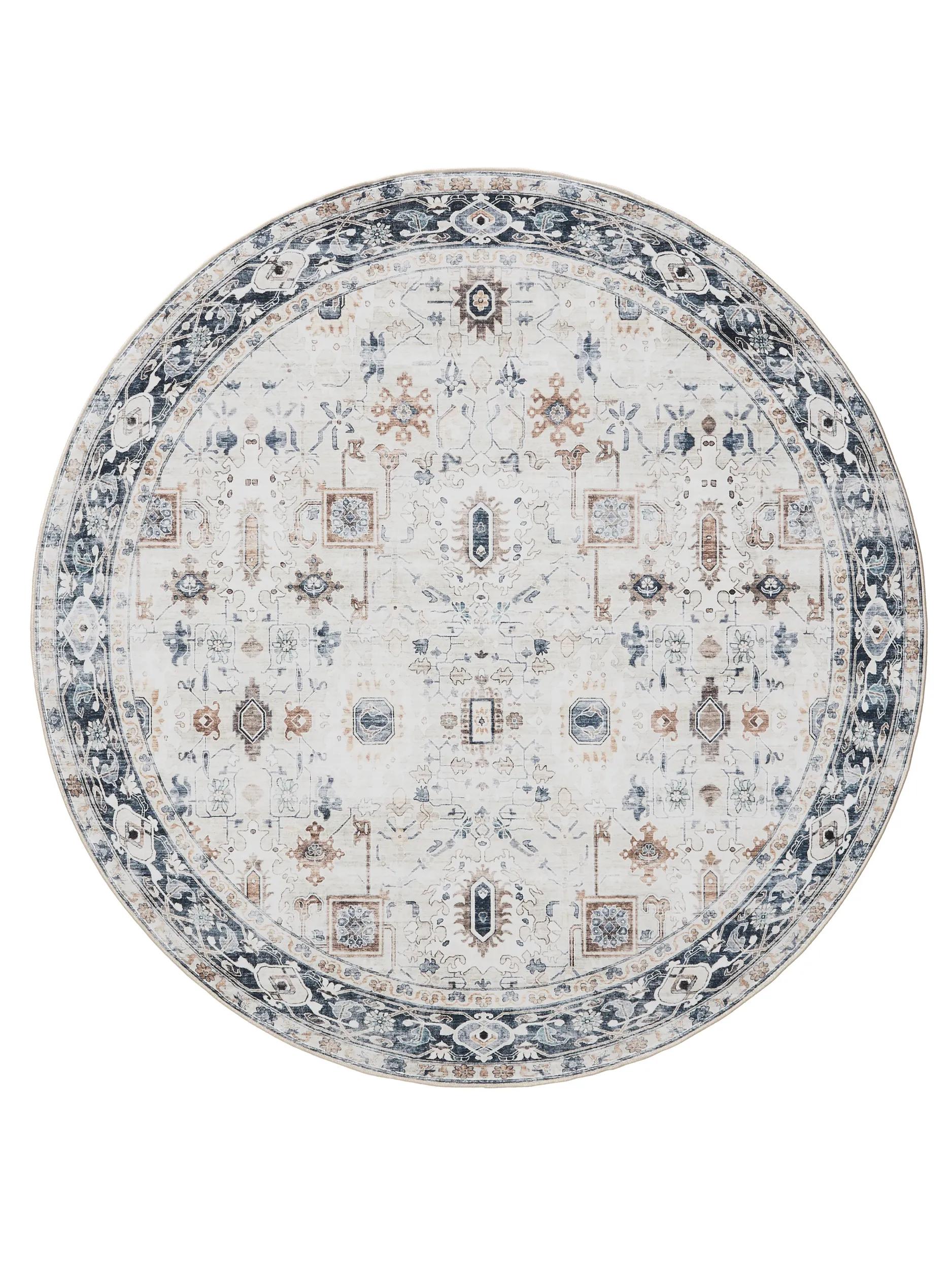 Tapis vintage motif ethnique rond blanc et bleu lavable 120 cm de diamètre