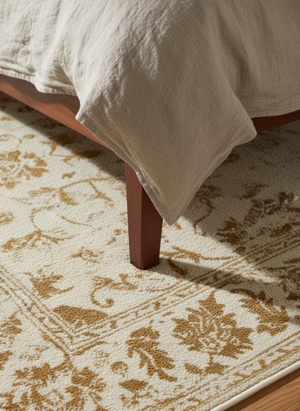 Sa palette influence la lumière comme un voile : les beige et camel adoucissent les tons, réchauffent les ombres et amplifient la sensation d’espace sans saturer. Les zones plus claires semblent absorber la clarté du jour, tandis que les teintes patinées gardent une profondeur minérale. Le toucher conserve une douceur nonchalante, idéale pour poser les pieds au réveil ou pour lire des heures durant, et la présence de ce tapis confère à la pièce une signature visuelle à la fois subtile et sensible.