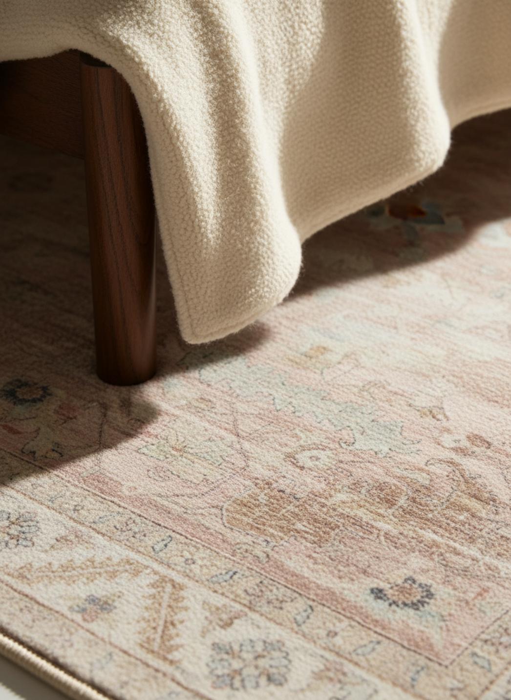 Sous les doigts, la surface révèle une texture travaillée, un relief discret qui raconte la douceur du tissage et le confort attendu sous les pas. La finition lavable ajoute une promesse de praticité : le charme ancien se marie à la modernité des usages, facilitant l'entretien sans trahir le caractère. Le toucher invite à s'asseoir, à poser un livre, à sentir la chaleur d'un foyer qui se construit autour de cet objet chargé d'histoire.