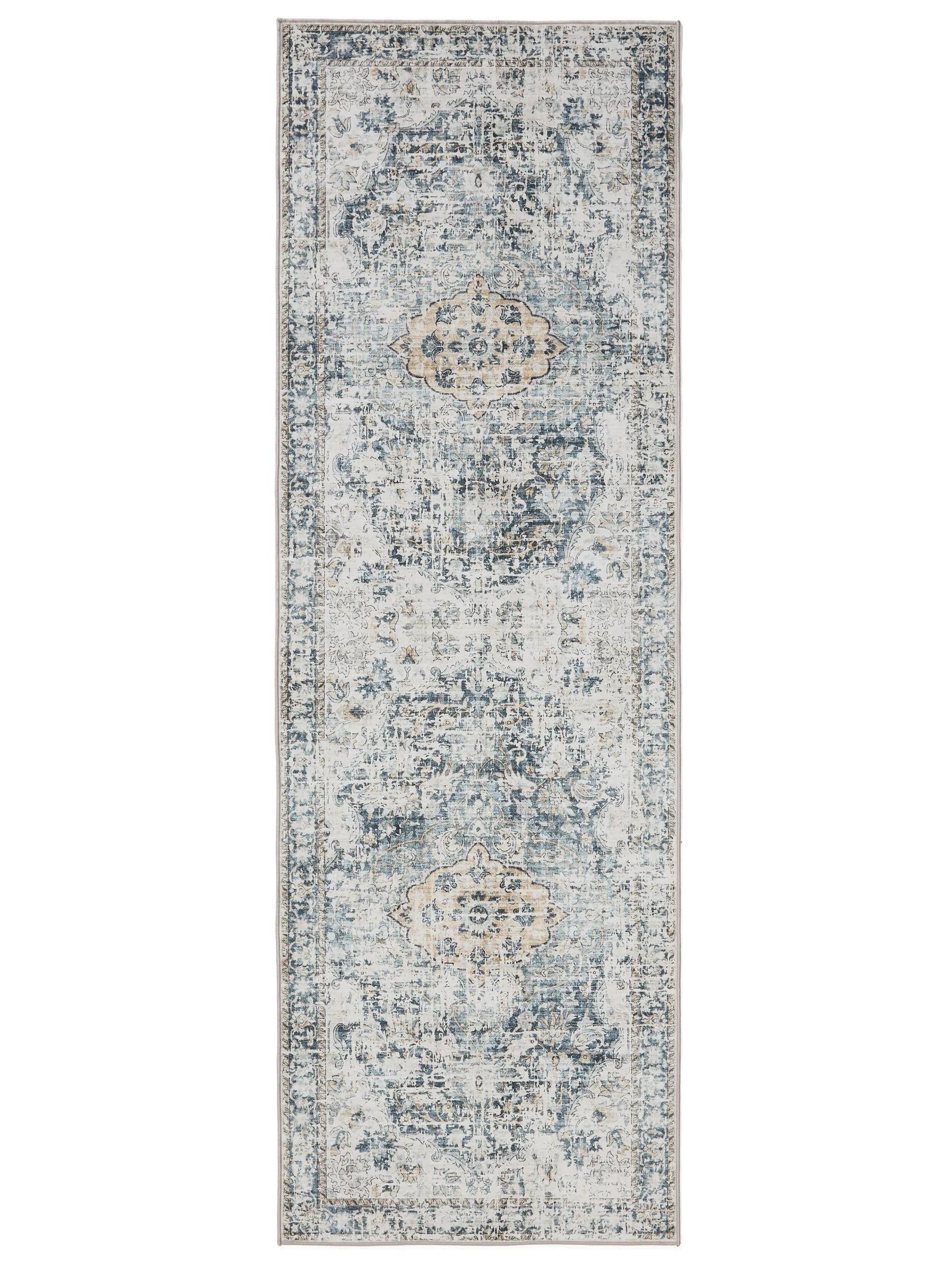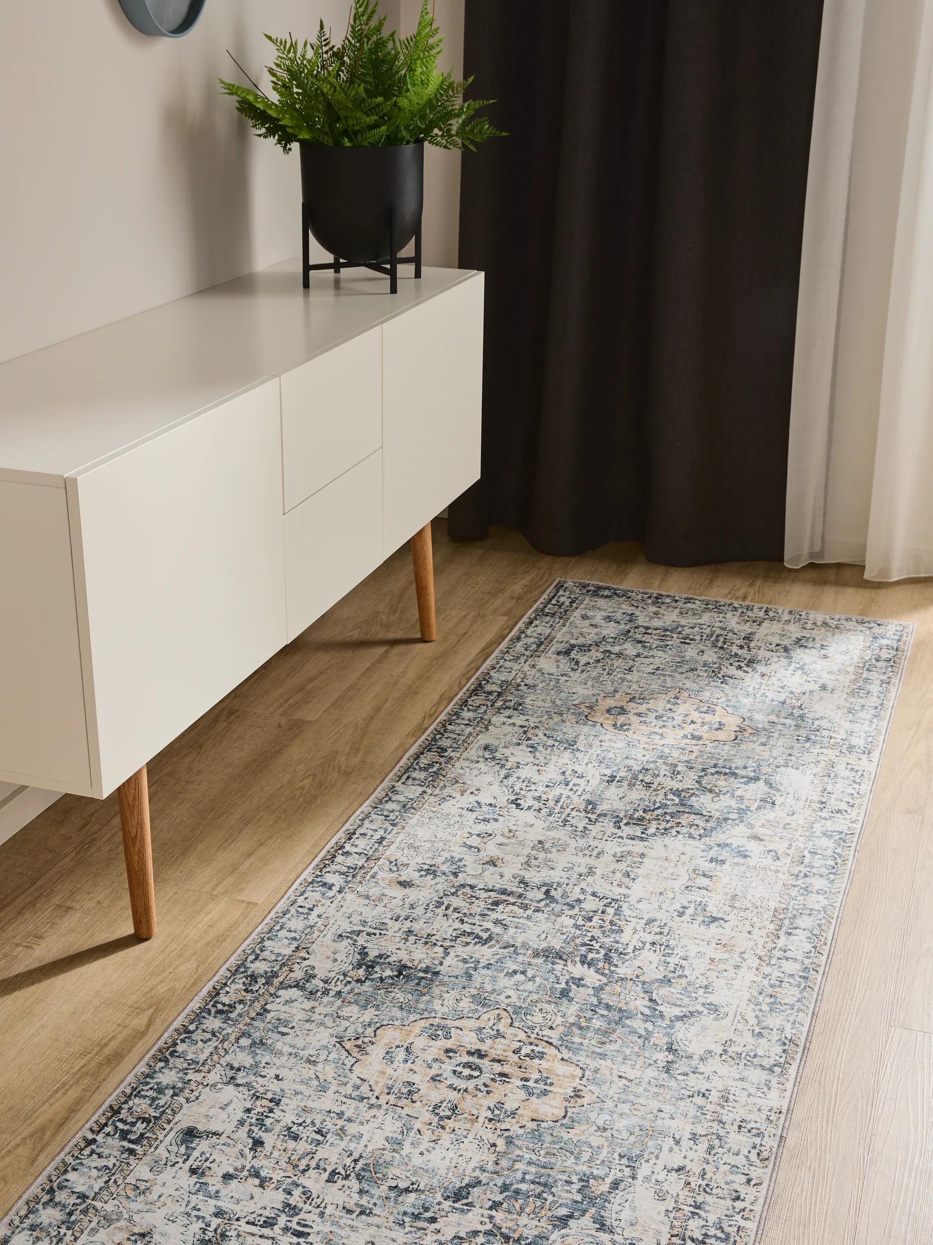 Tapis vintage motif floral de couloir beige et bleu lavable 80x240 cm