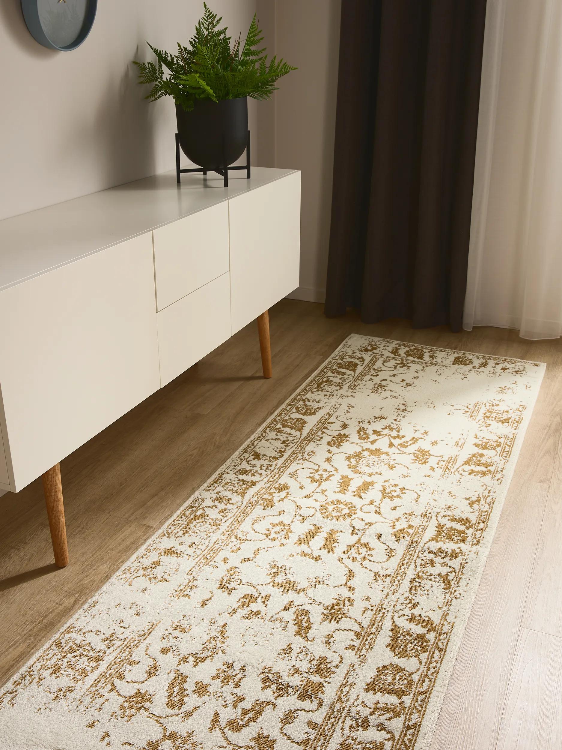 Lorsque l’on imagine ce format pensé pour un couloir, la pièce se transforme en un parcours raffiné : le 80x240 cm dessine une trajectoire et guide la lumière. Les nuances de beige réfléchissent les rayons, amplifiant la clarté sans durcir la pièce, tandis que le camel apporte une chaleur subtile qui souligne les meubles et les cadres. Les accents légèrement usés jouent avec les ombres, créant des contrastes doux et une profondeur chromatique qui change selon l’heure du jour. Le résultat est une mise en scène mesurée, idéale pour sublimer un couloir long ou structurer l’entrée d’un appartement.