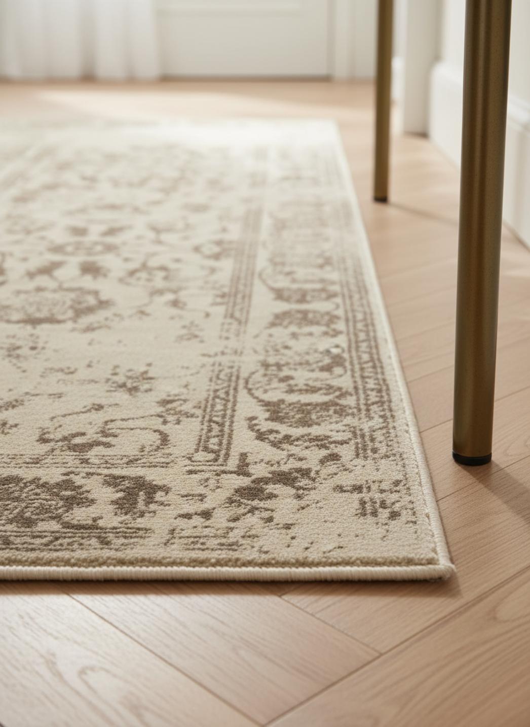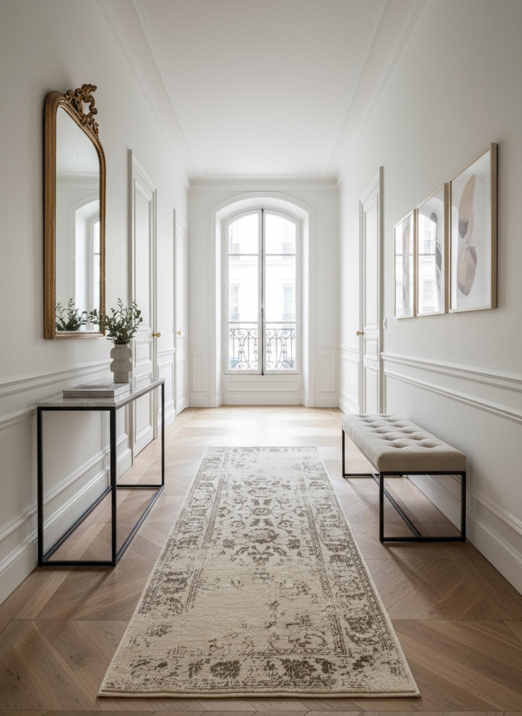 En situation, le modèle s’impose avec élégance dans un couloir où longueur rime avec invitation, transformant un passage en véritable mise en scène. Il sculpte l’espace en établissant un axe visuel, accompagne un banc, souligne une enfilade de portes et fluidifie les transitions entre salon et chambres. L’empreinte vintage et la douceur des matières adaptent la pièce à une ambiance chaleureuse et accueillante, sans effort d’entretien, juste le plaisir de voir vivre le tapis au quotidien.