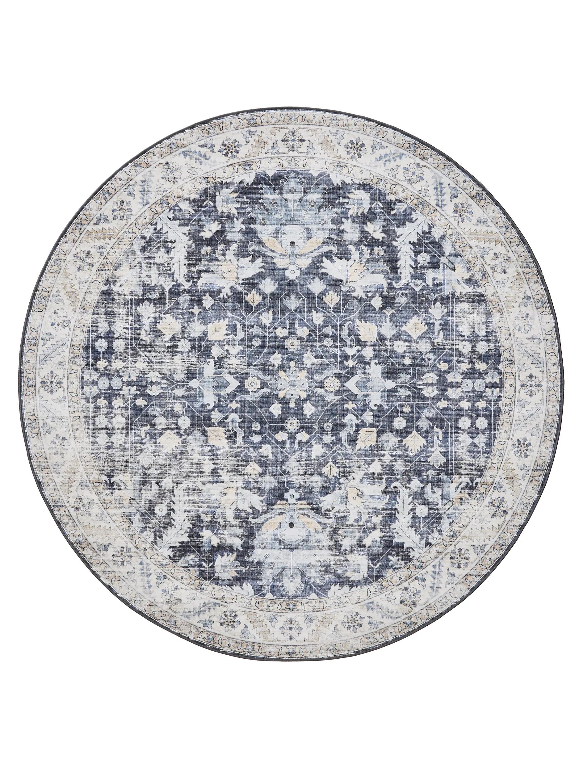 Tapis vintage motif floral rond bleu et beige lavable 160 cm de diamètre
