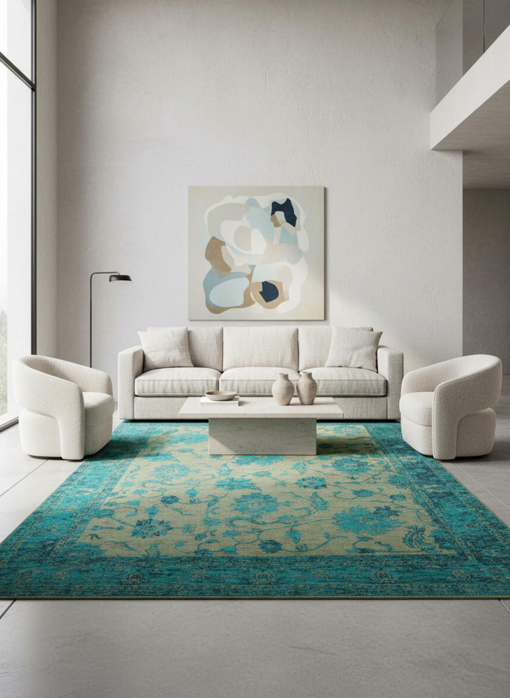 Dans le mobilier, il joue le rôle d’élément central et de point d’équilibre, où le décor prend une nouvelle assise. Le motif floral s’étire comme une fresque ancienne, mêlant ornementation et modernité délavée pour un effet « distressed » qui valorise le contraste entre élégance et simplicité. Au-delà de l’esthétique, ce tapis apporte une lecture graphique forte : répétitions, ponctuations colorées et zones plus effacées offrent une perspective changeante selon l’éclairage et la proximité.