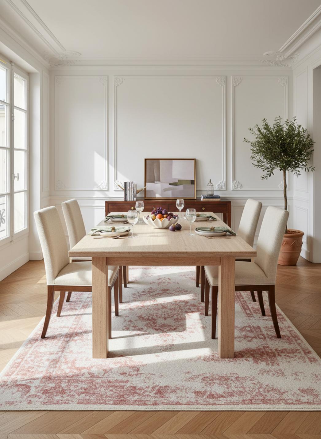 Imprégné d'une mémoire lente et lumineuse, ce tapis respire le charme vintage par ses teintes adoucies et son voile presque poudreux. La dominante claire laisse filtrer la lumière, et le rendu blanc se nuance de reflets patinés qui évoquent des après-midis baignés de soleil et des pièces où le temps a pris le soin d'estomper les contours. On perçoit une profondeur visuelle qui joue entre matière et lumière, un relief discret qui capte le regard sans jamais l'agresser.