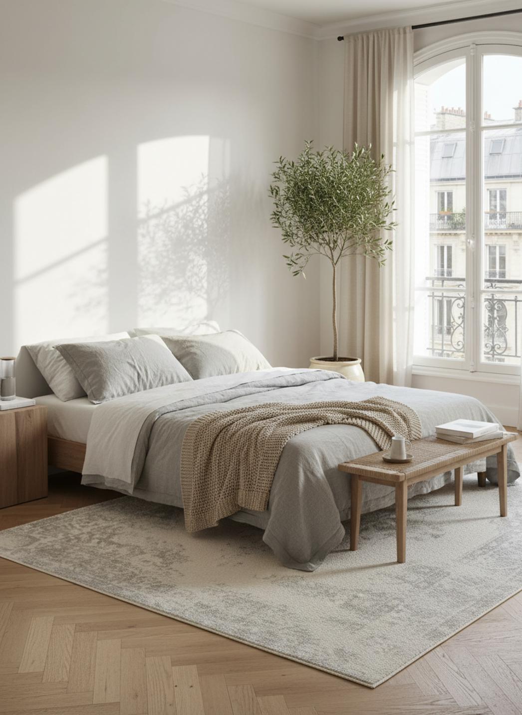 Les couleurs modulent la lumière de façon subtile : des nappes de blanc passé jouent avec des touches de vert clair qui évoquent les tons minéraux et les herbes séchées, tandis que les nuances atténuées filtrent le reflet des fenêtres pour une atmosphère feutrée. Ce jeu chromatique transforme la pièce, adoucit les contrastes et crée une ambiance sereine et accueillante.