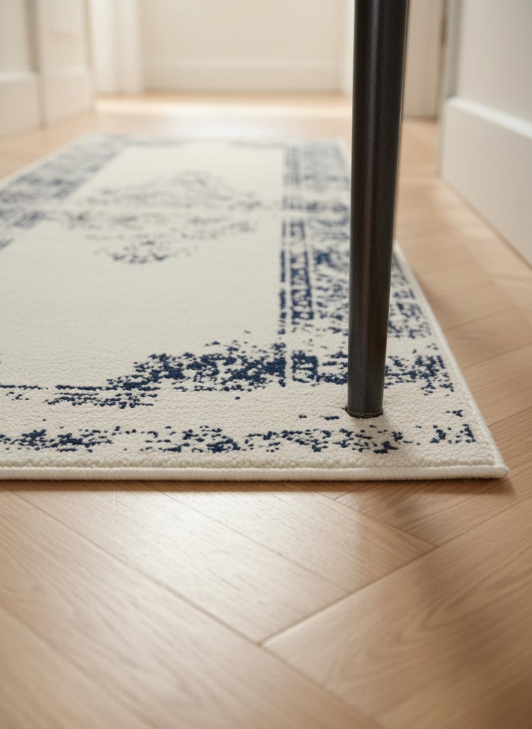 Dans un couloir, sa forme devient mise en scène ; ce couloir en longueur bénéficie d’une pièce qui allonge, guide et habille le passage. Les proportions, pensées pour un format de 80x240 cm, créent un parcours visuel harmonieux qui structure le mobilier environnant et attire l’œil vers des points de lumière ou des œuvres murales. Les motifs orientaux et les géométries bohèmes offrent un impact graphique saisissant, comme une carte ancienne réinterprétée, où les symétries survivantes dialoguent avec des zones volontairement effacées.