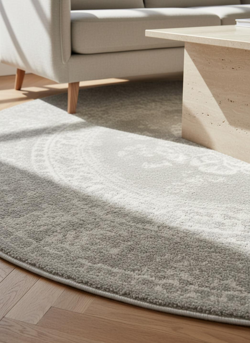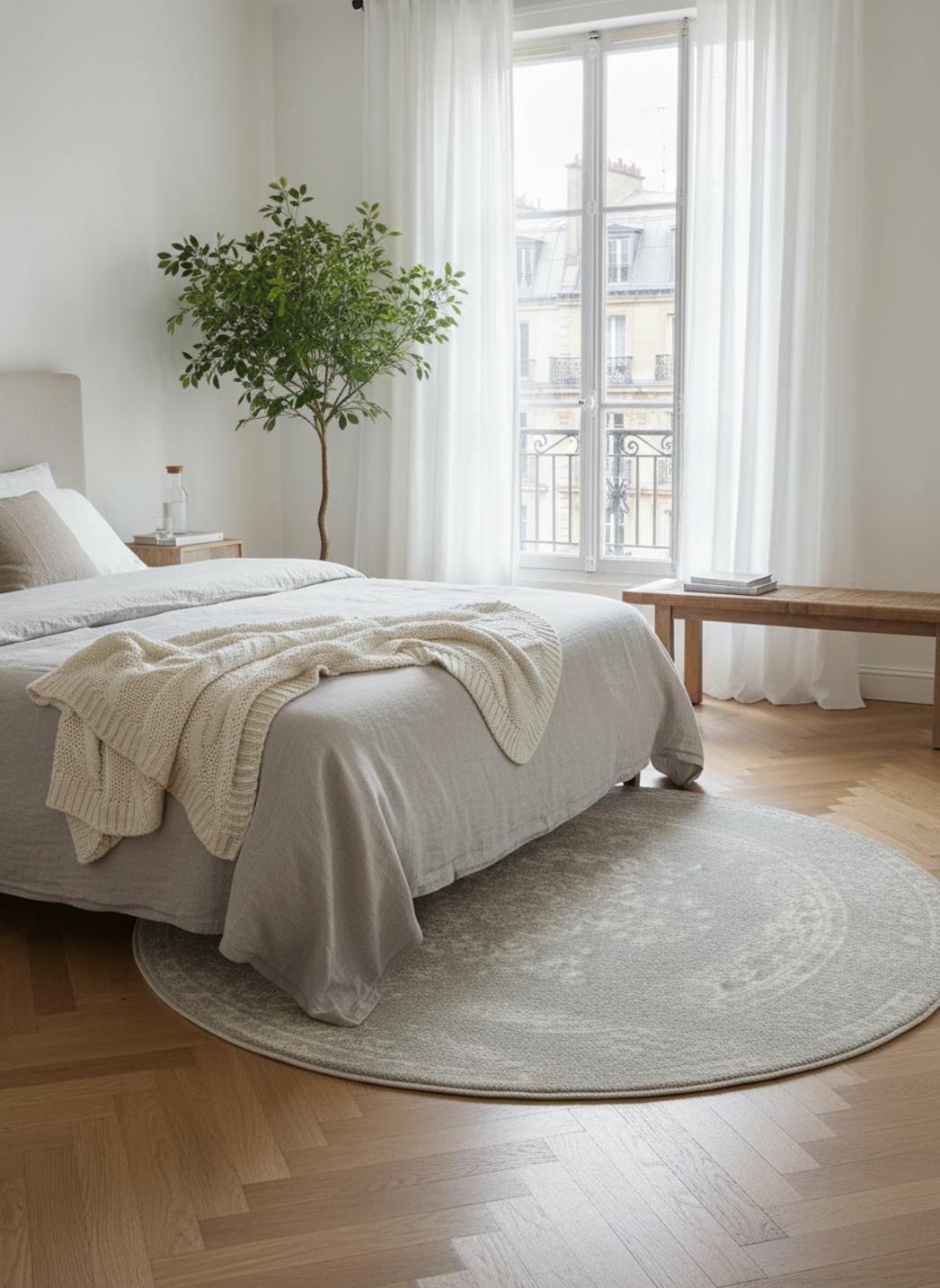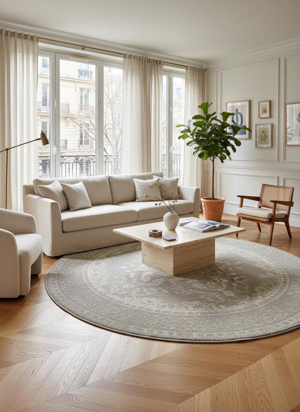 Autour de ce tapis, la forme s’impose comme un cocon visuel : le rond invite à la circulation et à la convivialité, encadrant un groupe de sièges ou isolant un fauteuil pour en faire un îlot de calme. Sa dimension de 160 cm se prête à des mises en scène équilibrées, capable de définir un espace sans le surcharger, apportant structure et douceur à la fois. Le charme patiné se marie à un caractère décoratif affirmé, capable de moderniser une pièce tout en évoquant le charme du temps.