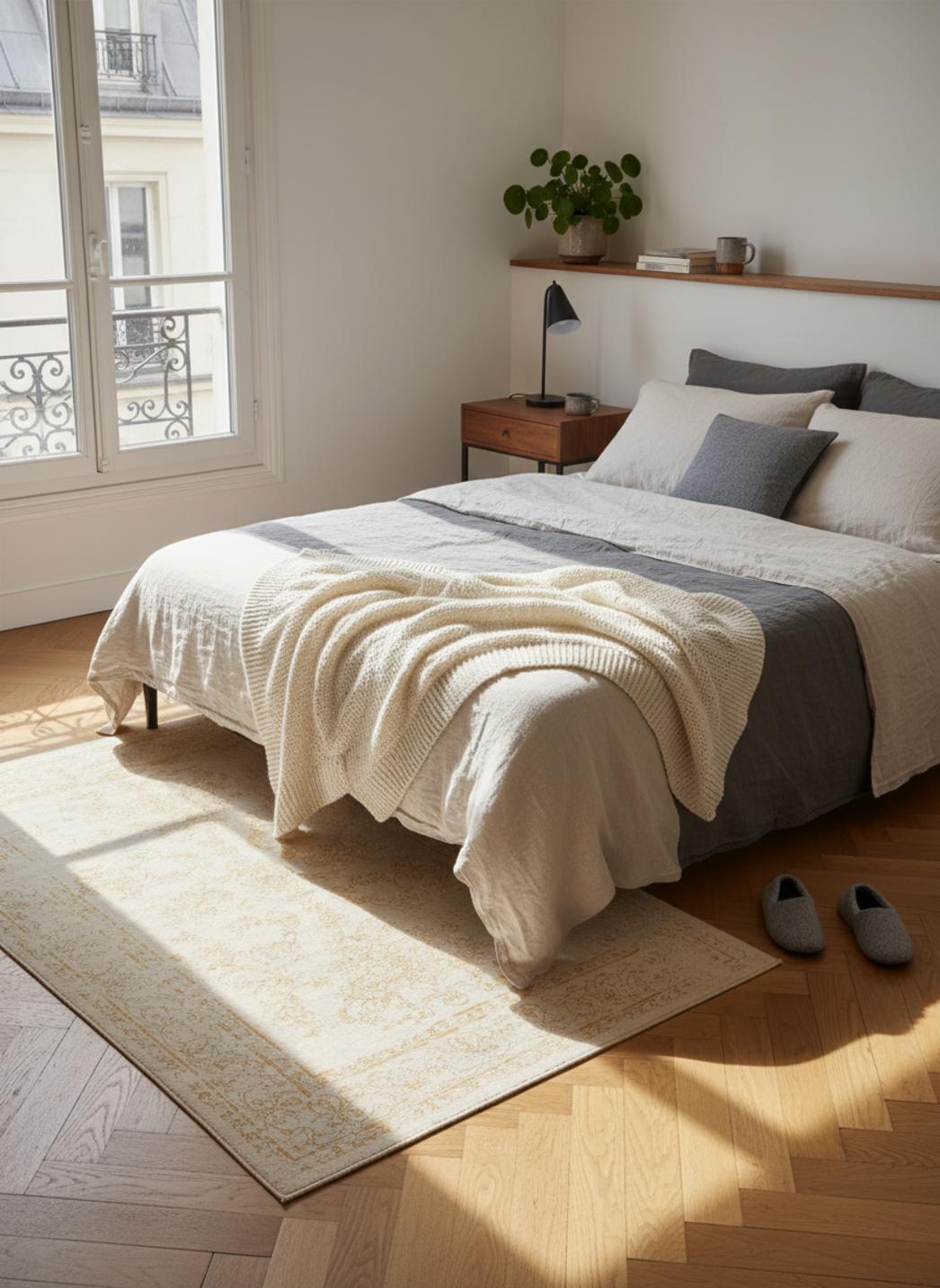 Dès le premier pas, la pièce raconte une histoire contenue dans un velouté usé : un tapis au charme vintage où les motifs semblent avoir été doucement effacés par le temps, offrant des plages de couleur qui respirent la mémoire. La palette joue entre le beige et le jaune, des tonalités passées qui filtrent la lumière comme un voile ancien, éclairant sans brutalité et posant une atmosphère feutrée et accueillante. Les arabesques et les entrelacs hérités d’un répertoire oriental se devinent sous un effet patiné, révélant une géométrie discrète qui mêle récit et décoratif, comme si chaque motif se racontait en douceur sous la plante du pied.