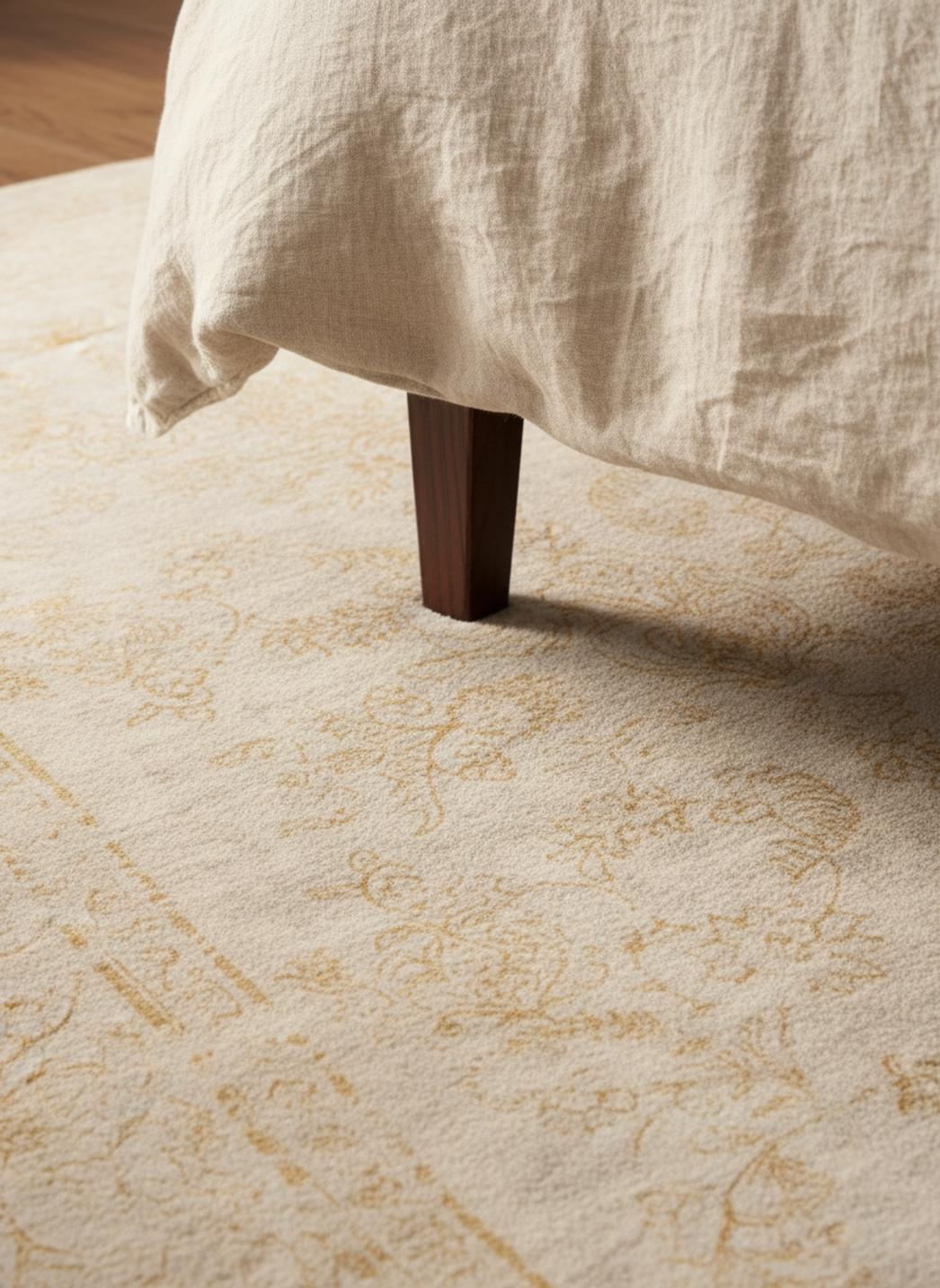 Sous la surface, la texture se fait confident : un relief travaillé, presque sculpté, qui invite au toucher et promet une douceur qui soutient le pas. Les nuances délavées créent des halos où le beige se teinte de poussières d’or et où le jaune prend des accents minéraux, modifiant la perception de la lumière et apportant une profondeur chromatique subtile. Le point de tissage se sent plus qu’il ne se voit, transmettant la sensation d’un textile habité, capable de transformer un salon en un salon de souvenirs ou un coin lecture en refuge paisible.