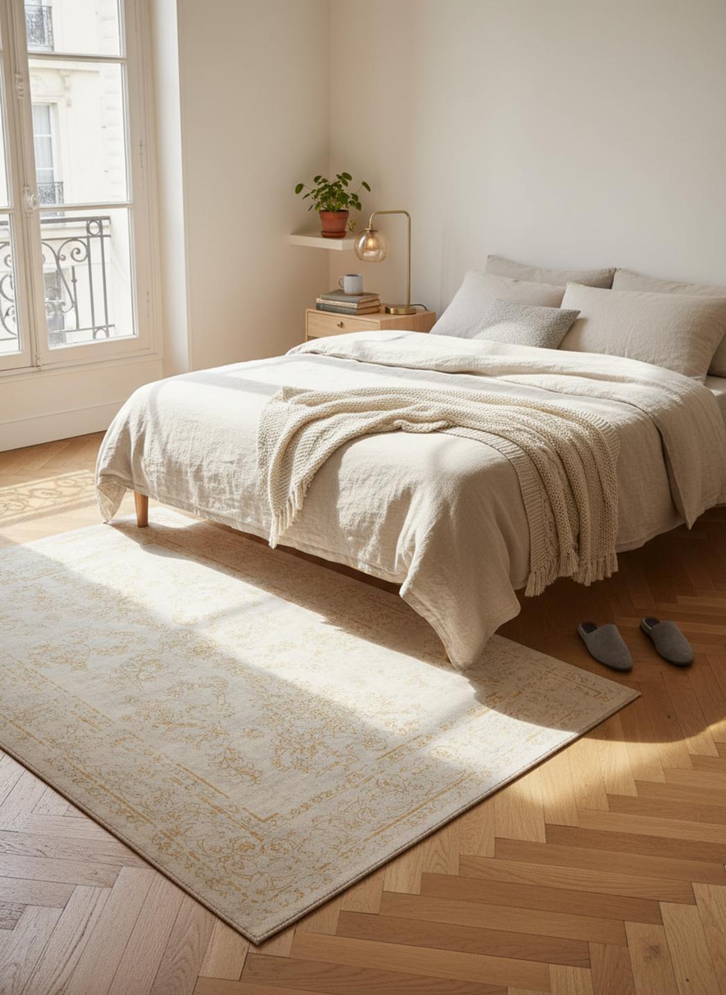Au toucher, la trame se dévoile en relief discret, une douceur travaillée qui accueille la plante du pied et transforme un coin lecture en refuge. L'équilibre entre confort et caractère fait de cet objet décoratif un point d'ancrage, capable de réchauffer une chambre comme de structurer un salon avec une grâce mesurée.