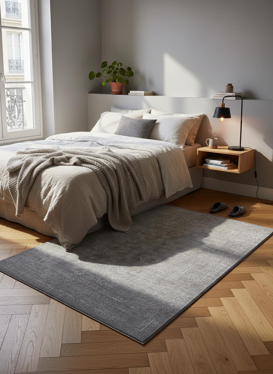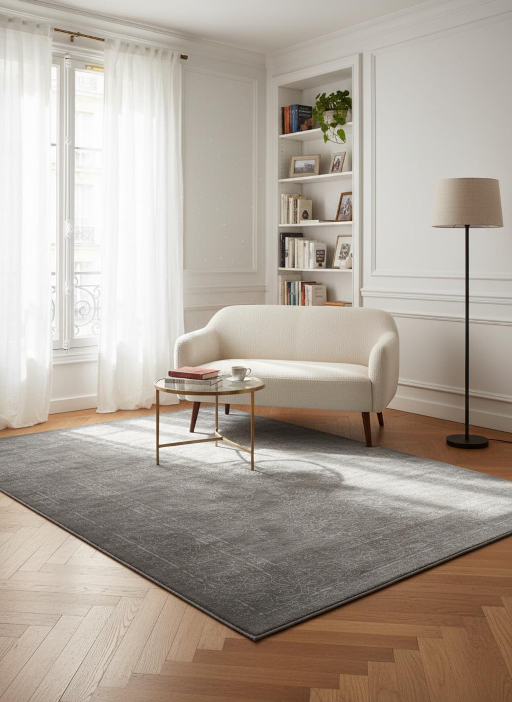 La texture travaille la lumière : des nuances de gris s’étalent comme des lavis, et des éclats de blanc reprennent la réflexion, offrant des plages claires qui font rayonner le mobilier alentour. Ces teintes passées transforment la luminosité, tamisent les rayons et donnent à la pièce une tonalité douce, presque cinématographique, où chaque pas révèle une nouvelle facette chromatique.