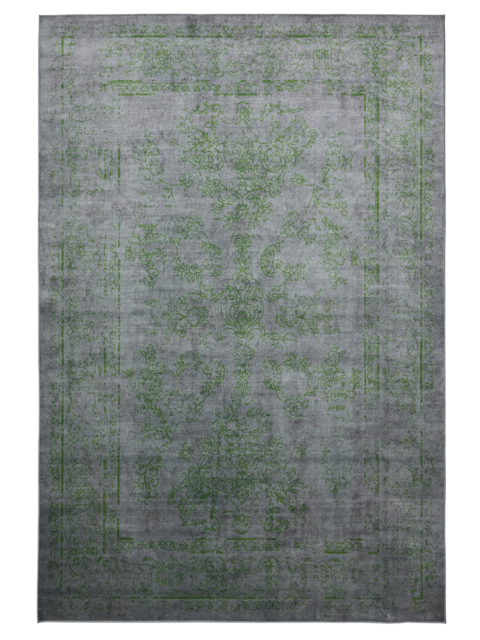 Chaque motif raconte une géométrie orientale revisitée, des arabesques adoucies et des médaillons qui dialoguent avec des bordures effacées, créant un effet légèrement distressed sans violence, comme si l’objet avait vécu plusieurs vies. La profondeur chromatique joue des contrastes feutrés, où le gris atténue le relief tandis que le vert apporte des accents de fraîcheur patinée.