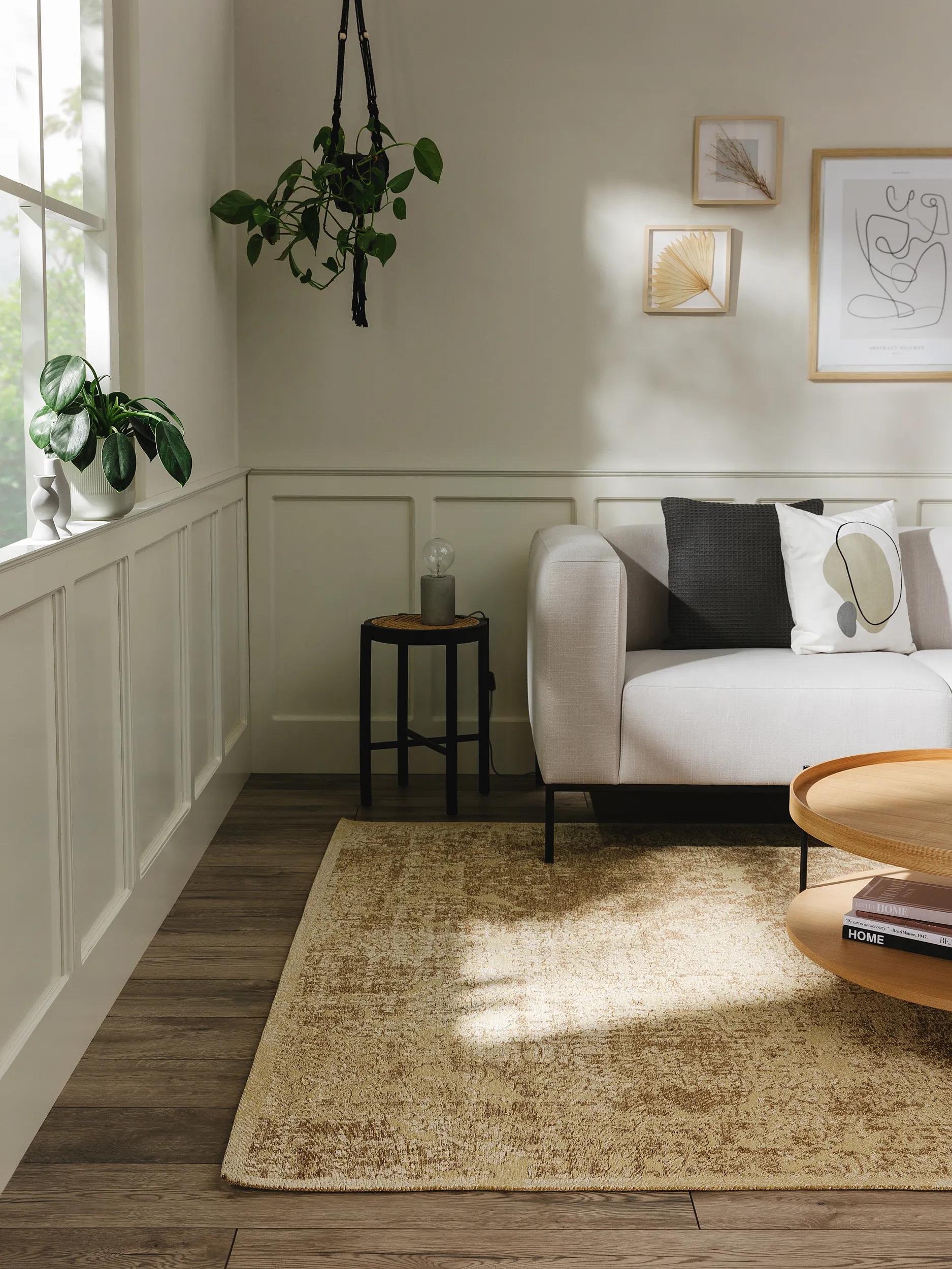 Lorsque la lumière du matin traverse la pièce, les teintes passent, se répondent et se rééquilibrent : les bruns s'assombrissent, les tons terreux s'adoucissent et la nuance patinée prend des reflets feutrés. L'effet délavé, volontairement recherché, capte le regard et module la luminosité ambiante, transformant une chambre en refuge et un séjour en lieu d'histoire. Le caractère graphique des motifs orientals, entre géométrie et arabesque, affirme une présence décorative sans dominer.