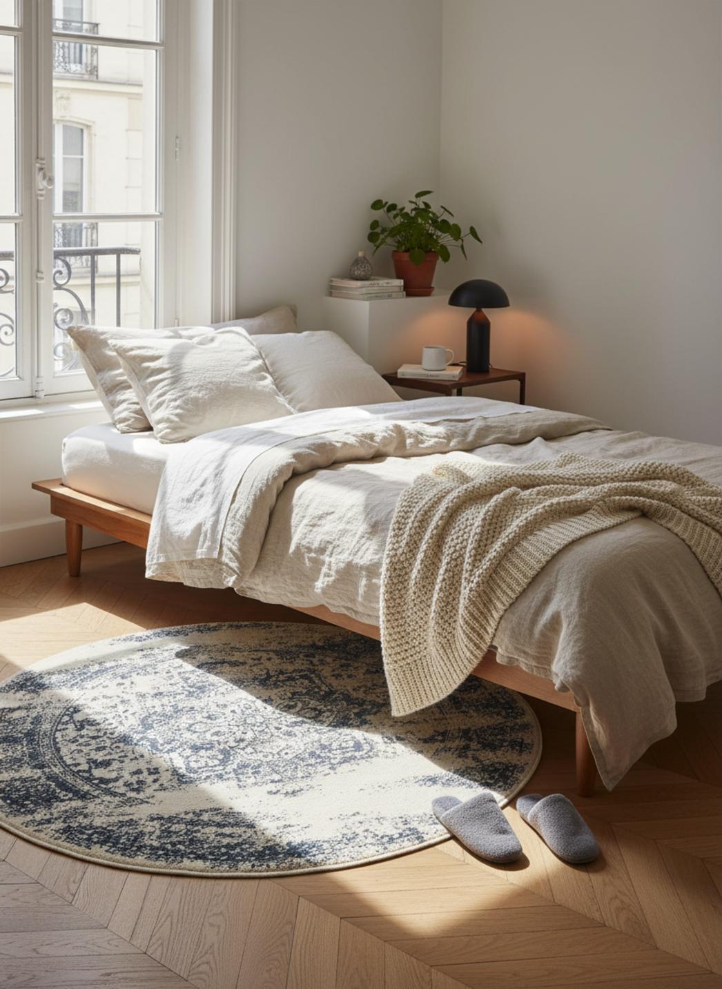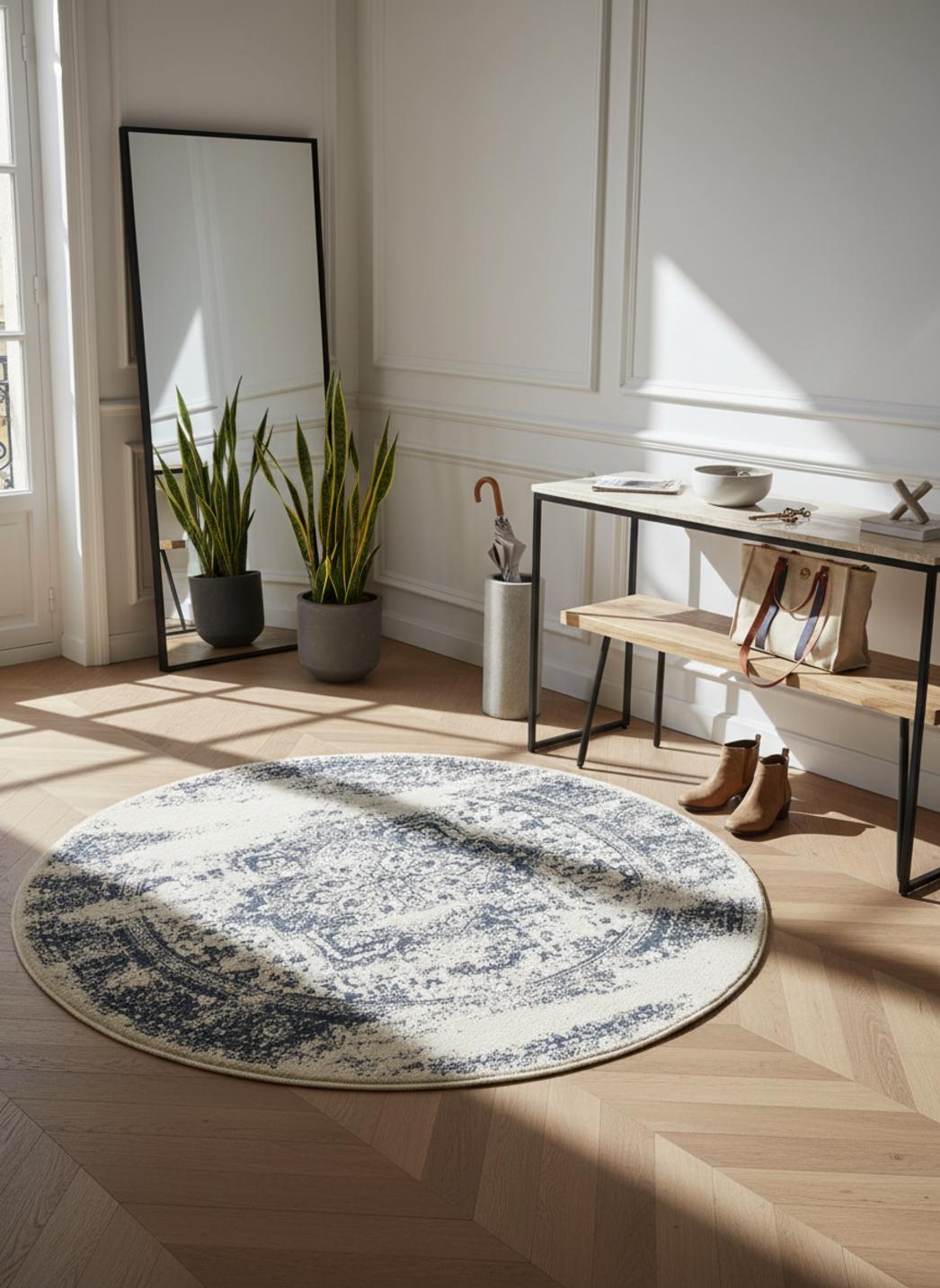 La rondeur assumée du format évoque un cocon, une scène centrée où chaque meuble trouve son équilibre. Ce tapis rond de 120 cm de diamètre structure l'espace en douceur et invite à la mise en scène : lampe d'appoint, fauteuil enveloppant, table basse délicate deviennent autant d'acteurs d'un tableau harmonieux. Les couleurs modifient la perception de la lumière, les beiges diffusent la clarté tandis que les bleus retiennent la profondeur, créant une sensation d'espace tempéré et feutré qui transforme un salon, une chambre ou un coin lecture en lieu de contemplation.