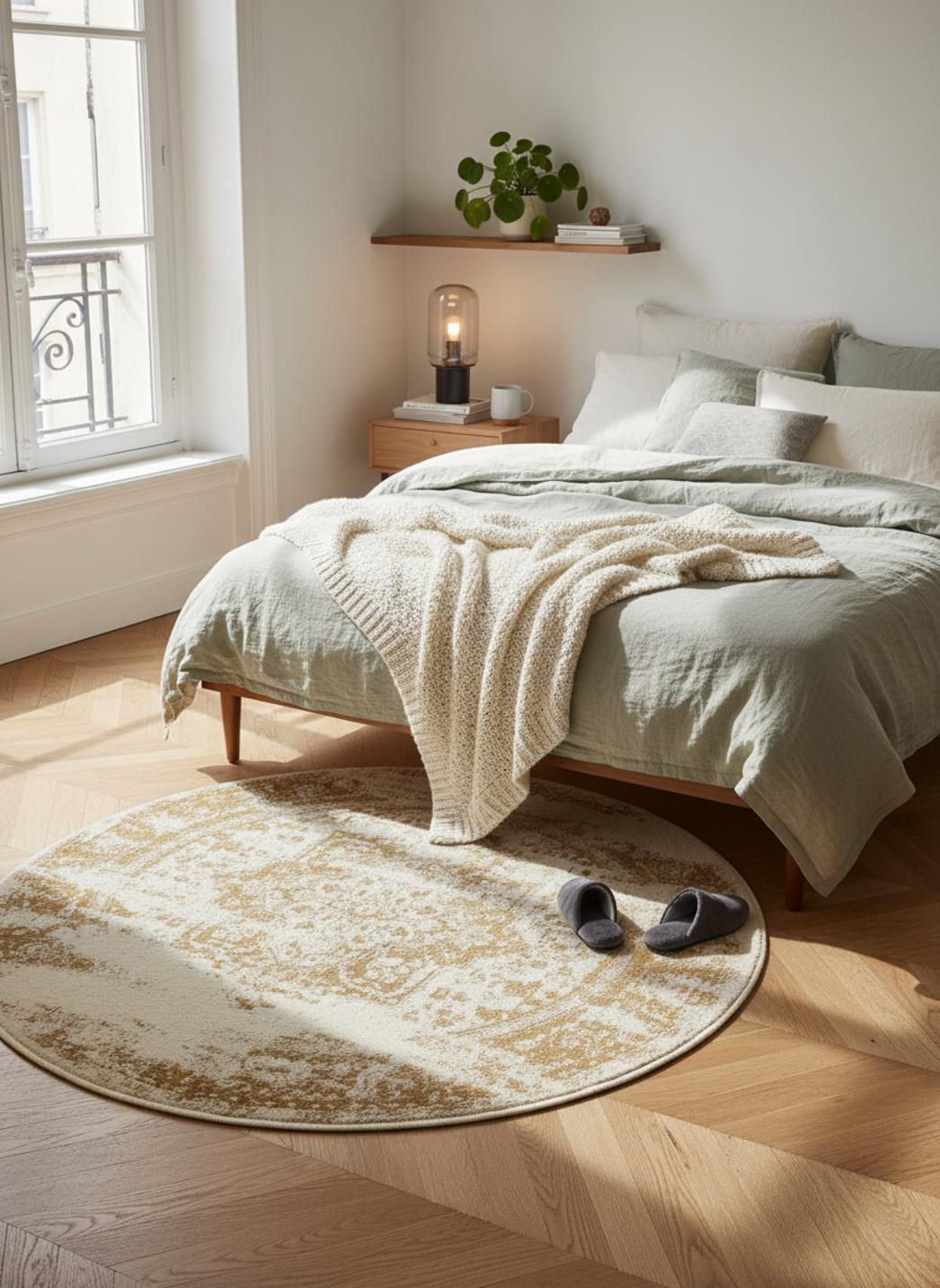 La présence rond de la pièce apporte une douceur visuelle immédiate, comme un cocon posé au sol : un format pensé pour inviter à la pause et pour structurer l'espace sans rompre son harmonie. Sa dimension contenue de 120 cm de diamètre en fait une pièce polyvalente, idéale pour accompagner un fauteuil, souligner une table basse ou délimiter un espace de lecture, tout en conservant une élégance mesurée.