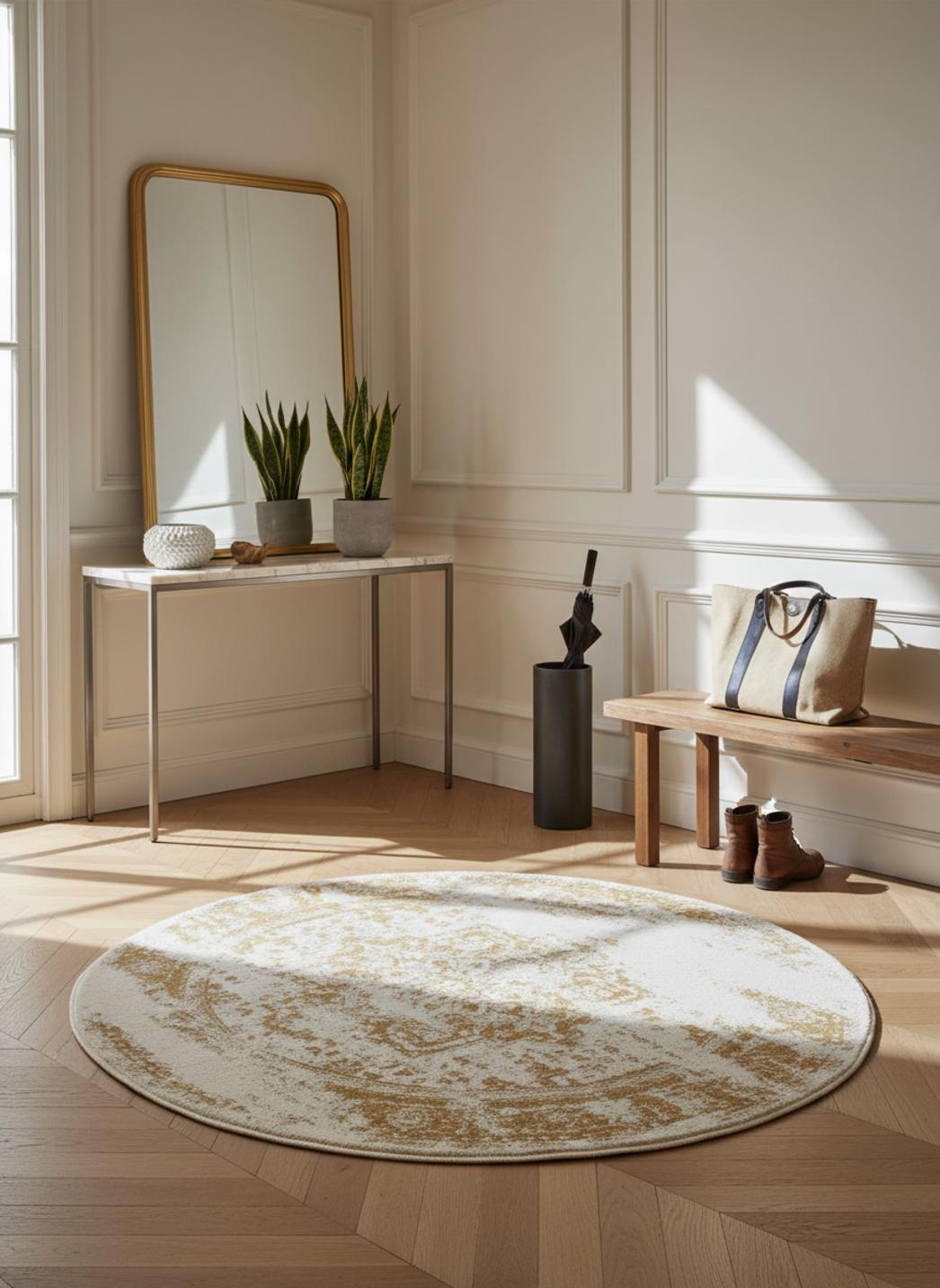 On entre dans une pièce et le regard se pose immédiatement sur une surface où le temps semble s'être délicatement imprimé : un tapis au charme vintage qui joue des estompages et des patines, mêlant des nappes de beige et de camel comme autant de pages jaunies d'un livre ancien. L'évocation du vécu se lit dans chaque fibre apparentée au temps, dans les teintes adoucies qui laissent filtrer une lumière douce et feutrée, comme si le soleil avait passé la main sur le dessin pour l'apaiser.