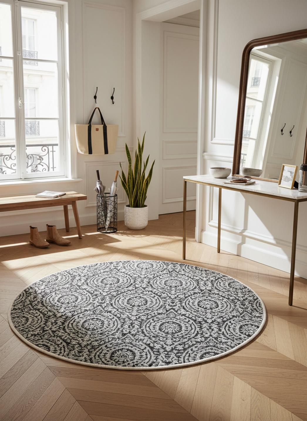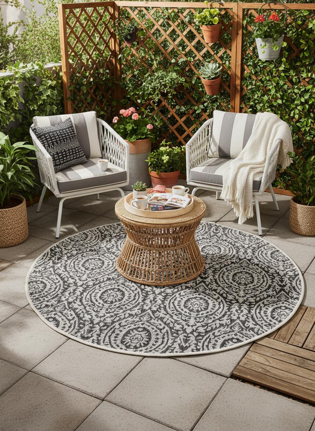Élégant et intemporel, ce tapis au style vintage oriental séduit par sa forme ronde et le contraste raffiné de ses tons blanc et noir. D’un diamètre de 120 cm, il s’intègre parfaitement sur une terrasse, un balcon ou un patio, apportant une touche de caractère et d’équilibre à la décoration extérieure. Son motif inspiré des tapis orientaux traditionnels se réinvente dans une version graphique et moderne, mêlant harmonieusement finesse des détails et sobriété des couleurs. Le blanc illumine l’espace, tandis que le noir apporte profondeur et élégance, créant un équilibre visuel sophistiqué. La forme ronde adoucit les lignes du mobilier et favorise une circulation fluide, idéale pour structurer un coin détente ou accompagner une table d’extérieur. Ce tapis s’accorde aussi bien à une ambiance bohème qu’à un décor contemporain. Véritable accent décoratif, il transforme les extérieurs en lieux raffinés, lumineux et empreints d’un charme oriental revisité.