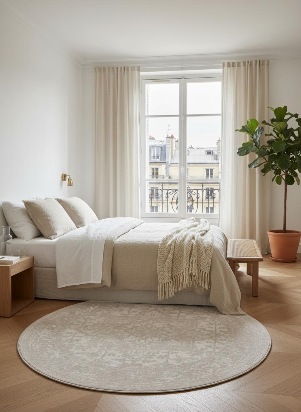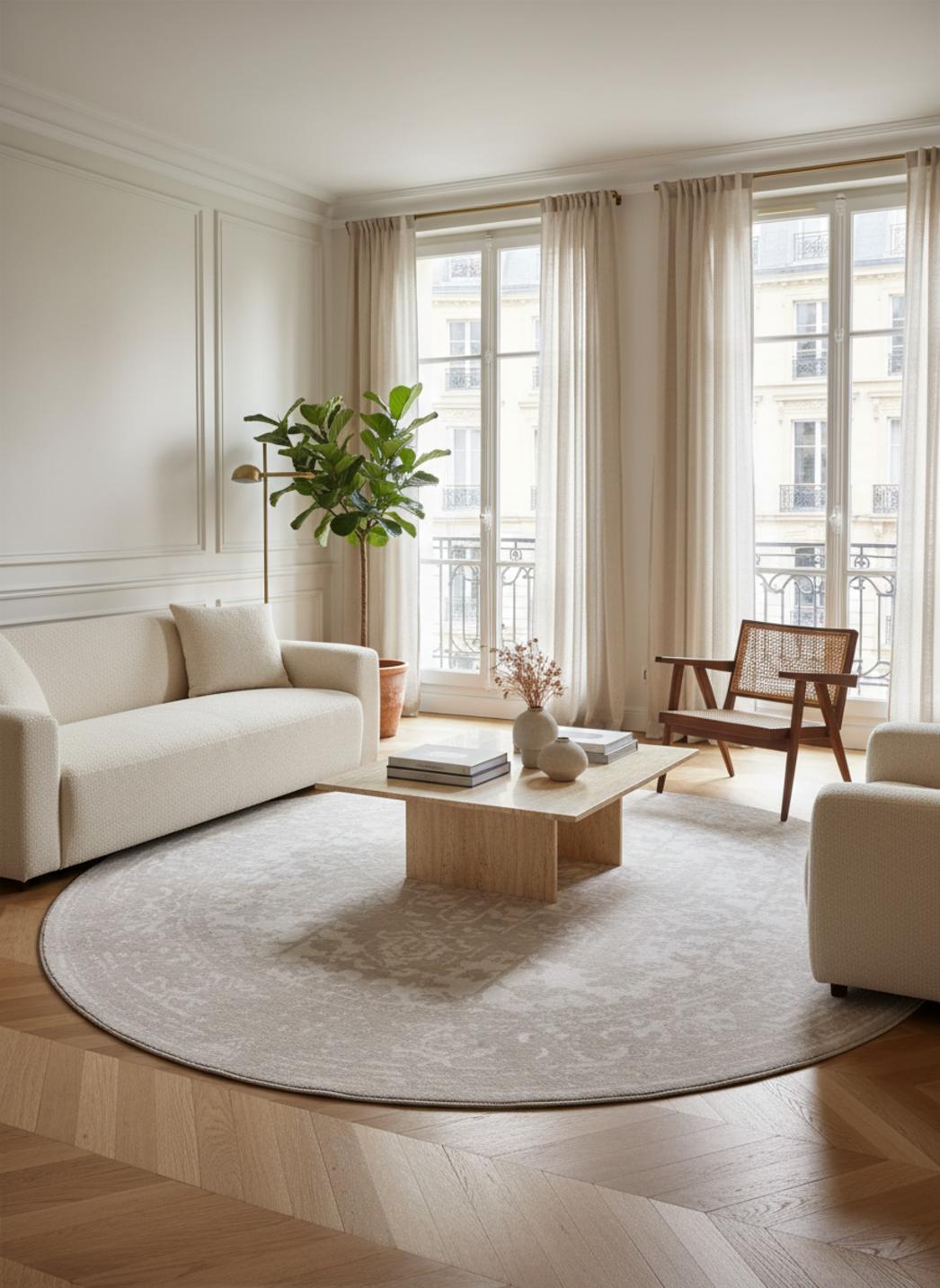 Lorsque l'on imagine sa silhouette, le format 160 cm incarne une présence intime, idéale pour un coin lecture, un salon cosy ou une alcôve propice à la contemplation. Le choix d'un tapis rond souligne un effet cocon ; son contour invite au rassemblement des meubles et arrondit l'espace, apportant une douceur visuelle et une circulation harmonieuse du regard.